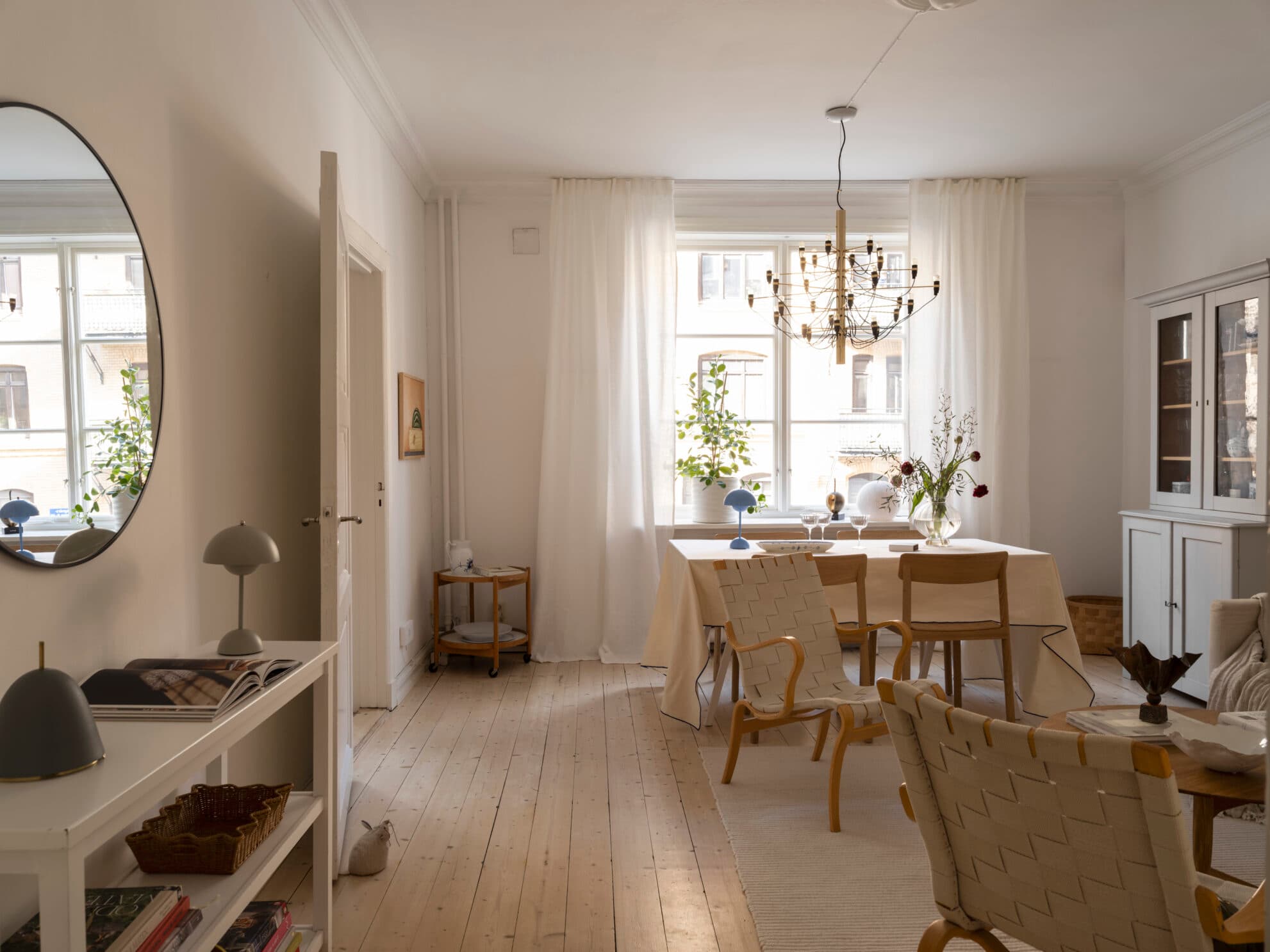 Vardagsrummet präglas av en generös takhöjd om cirka 2,8 meter som skapar en härligt luftig och inbjudande atmosfär. Det ljusa plankgolvet i trä löper enhetligt genom rummet och bidrar till en varm, tidlös känsla. De ljusa väggarna samspelar fint med det generösa ljusinsläppet från de spröjsade fönstren, vilket ger rummet ett mjukt och harmoniskt uttryck. Planlösningen erbjuder ett tilltalande rum i fil med intilliggande sovrum, vilket skapar en naturlig rymd och flexibilitet i dispositionen. Sammantaget är detta ett rymligt och trivsamt vardagsrum med klassiska detaljer och en ljus, luftig karaktär.
