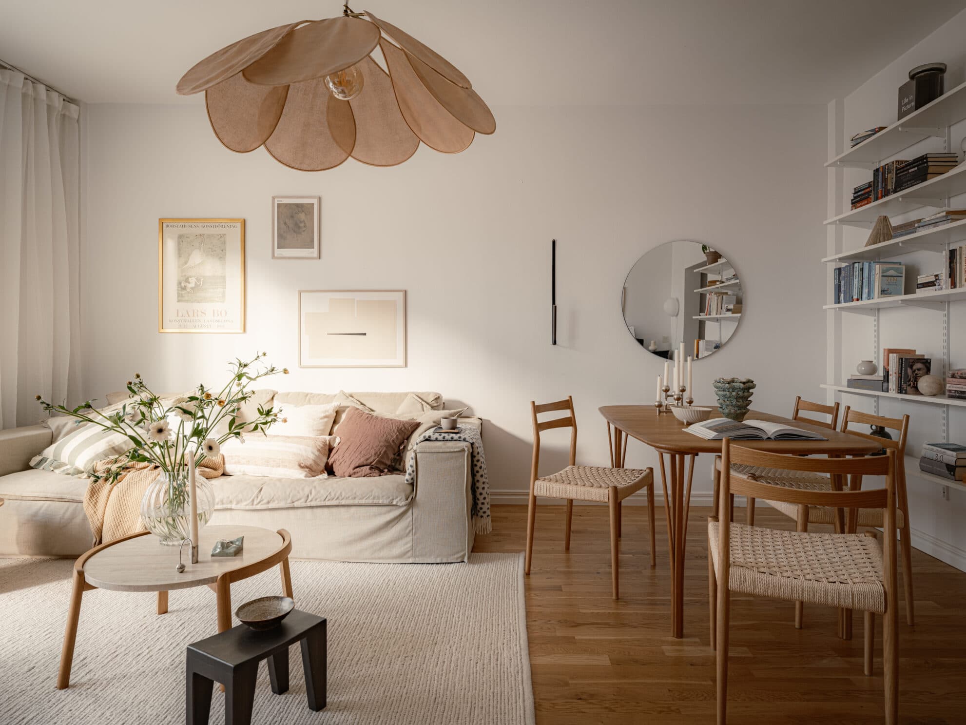 Vardagsrummet är generöst tilltaget och rymmer med lätthet både en inbjudande soffgrupp och ett större matsalsbord för långa middagar i gott sällskap. Härifrån nås den rymliga träaltanen – ett underbart extrarum under årets varmare månader, där eftermiddagssolen bjuder in till lata kaffestunder och stämningsfulla grillkvällar. Ljus parkett samspelar vackert med vitmålade väggar, och de stora fönsterpartierna tillsammans med den generösa takhöjden skapar ett fantastiskt ljusflöde och en luftig atmosfär.