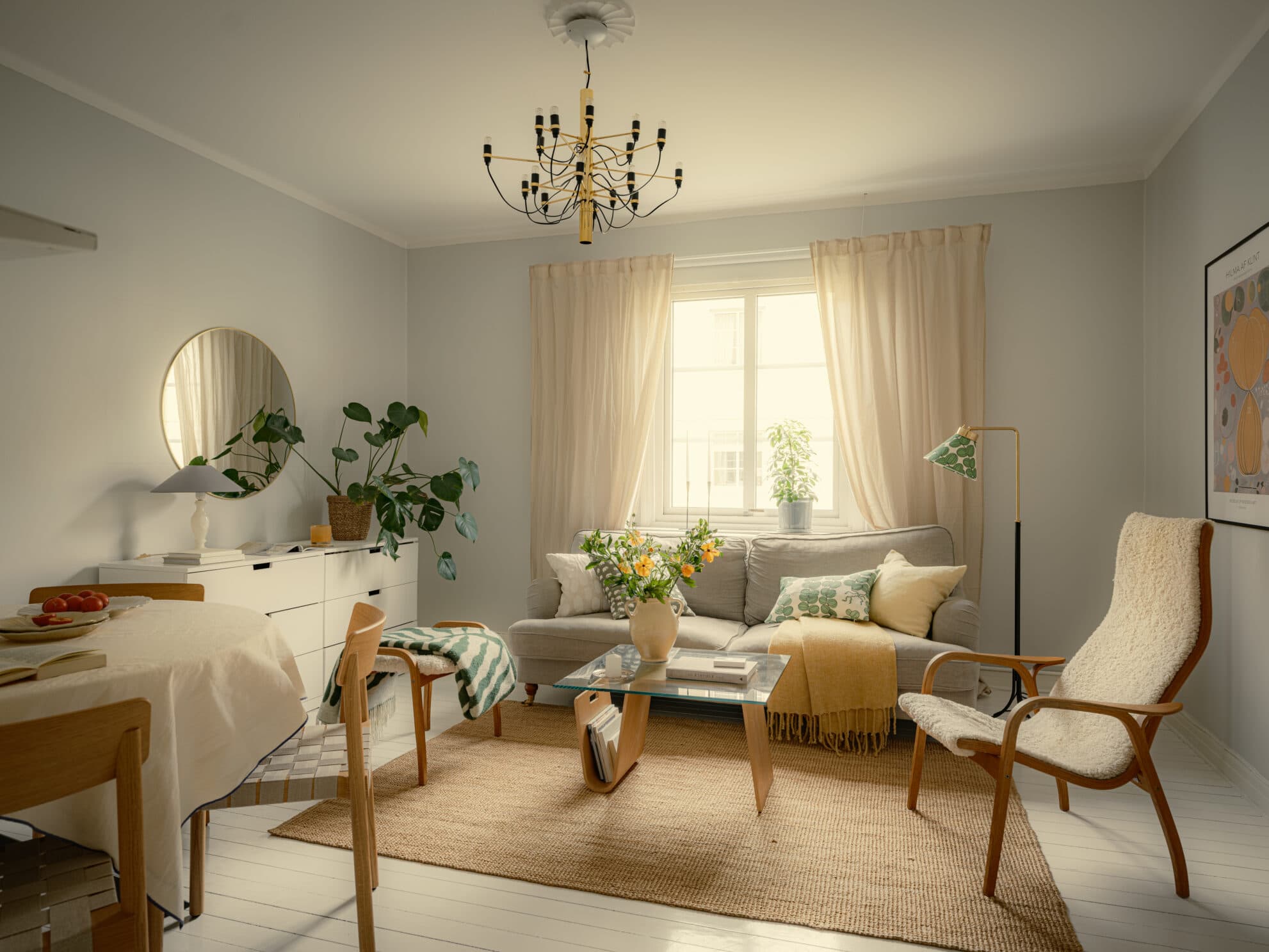 I vardagsrummet möter duvblå väggarna det vitlackade trägolvet som löper vidare in här. Den generösa takhöjden om 2,7 meter ger rummet extra rymd och tillsammans med ljusinsläppet skapas en luftig och inbjudande atmosfär. Här finns gott om plats för både soffgrupp och matbord, vilket gör rummet lika lämpat för vardag som för sociala tillställningar.