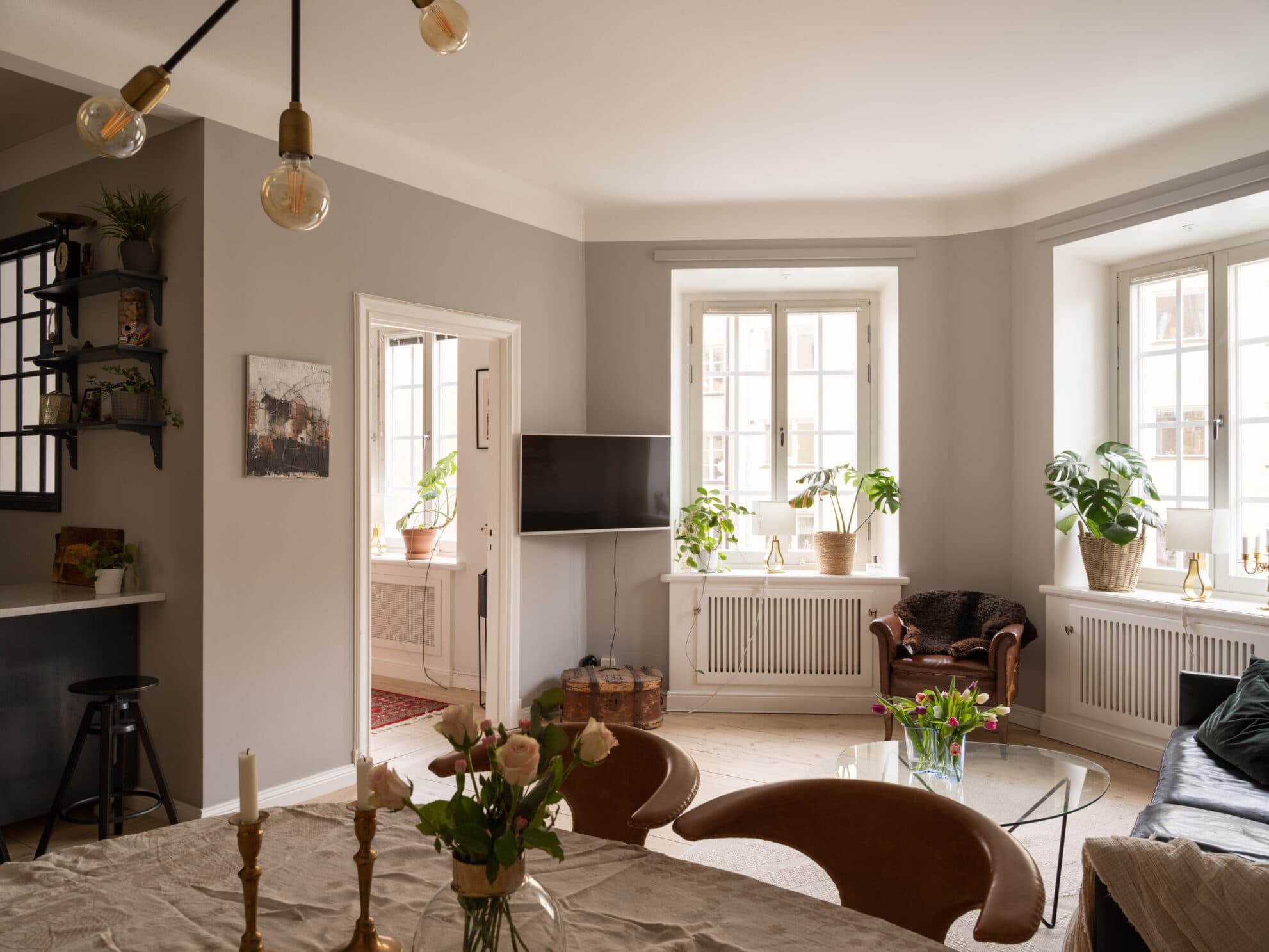 Ett ljust och underbart rum med drygt 3 meter i tak och ljuvliga trägolv. Två spröjsade fönster med djupa nischer ger ett fint ljusinsläpp. Gott om plats för soffa och större matbord.