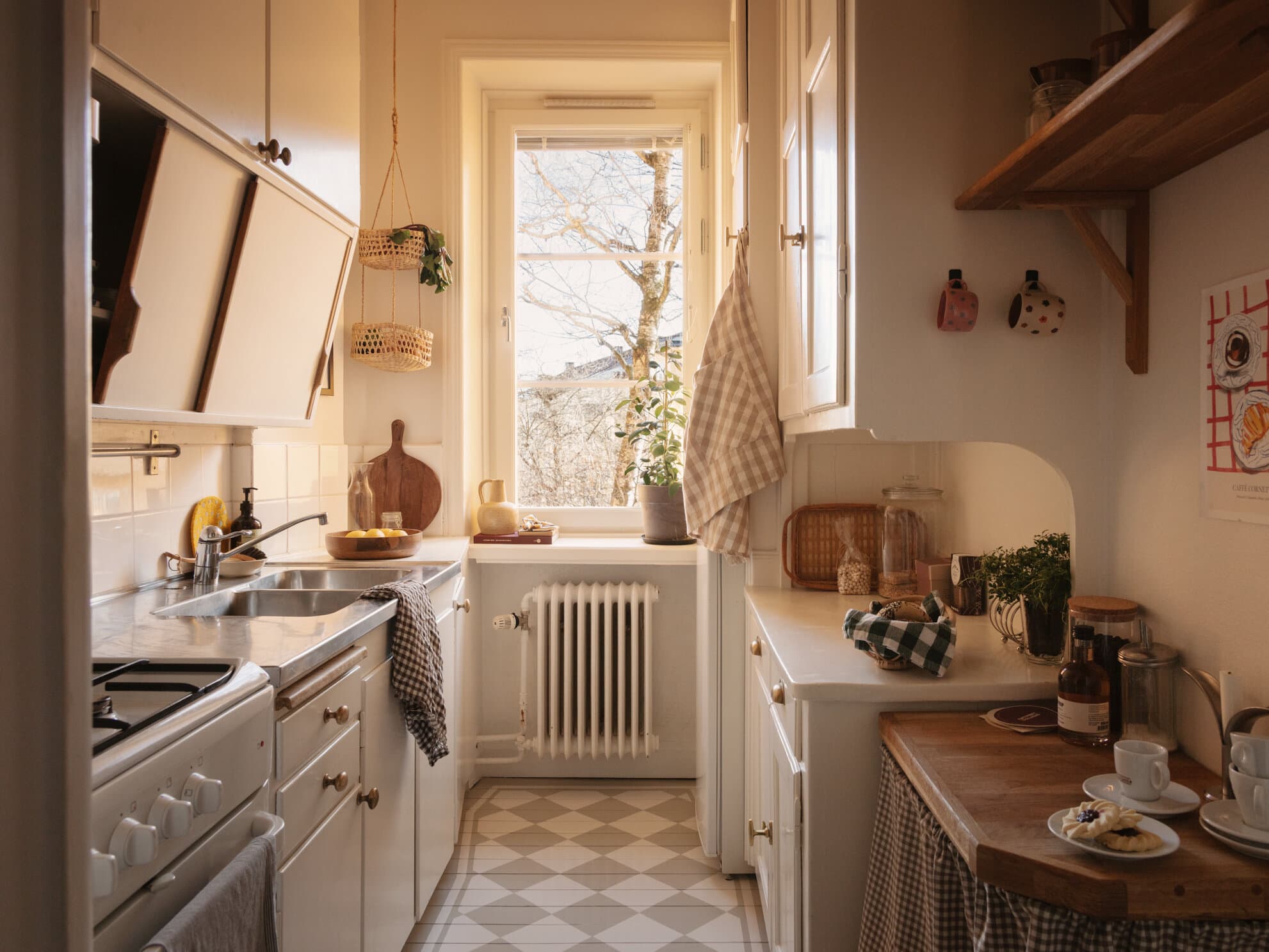 Ett mycket charmigt och karaktärsfullt kök där originaldetaljerna får ta plats. Det målade rutiga trägolvet sätter en personlig prägel, och tillsammans med bevarat serveringsskåp och tidstypiska snickerier skapas en varm och inbjudande atmosfär. Köket är utrustat med spis, ugn, fläkt, kyl/frys samt diskho med goda arbetsytor. Förvaringen är generös tack vare både originalskåp och kompletterande lösningar. Gulligt fönster med utsikt mot den lugna innergården.