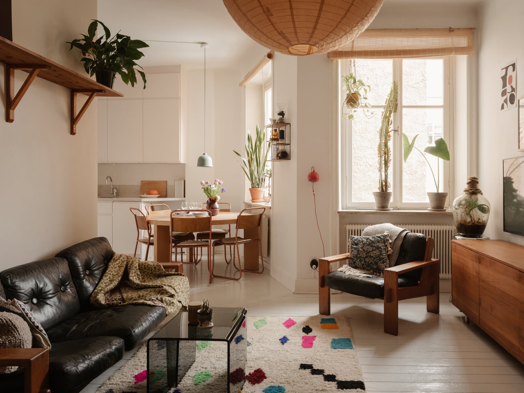 Ett rymligt vardagsrum med två fönster ut mot lugn innergård och utsikt över himlen och takåsarna. Fint trägolv och rejäl takhöjd på ca. tre meter Platsbyggda garderober ger god förvaring.