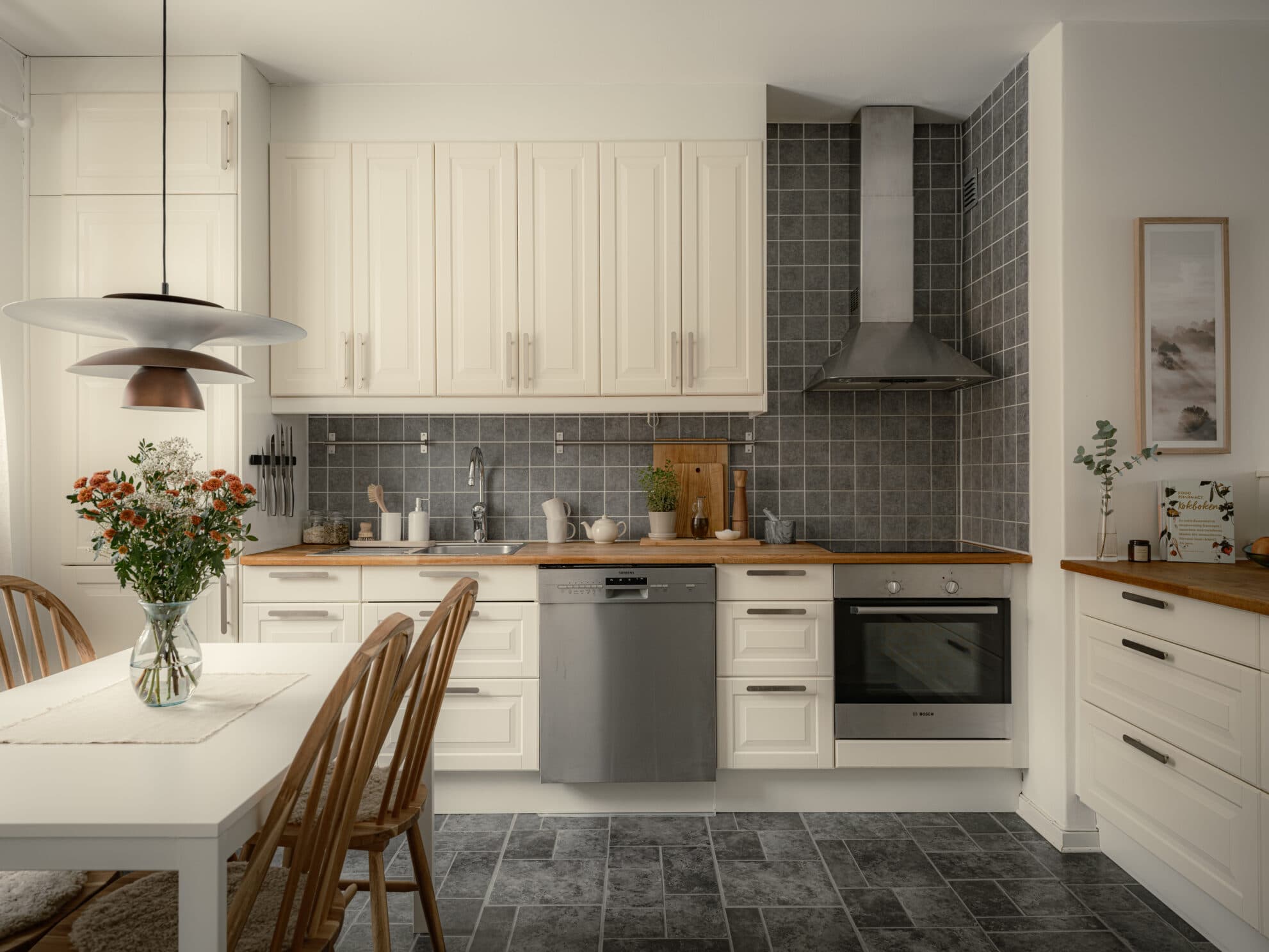 Köket är stilrent och funktionellt med vita luckor från IKEA, bänkskivor i ek och grått kakel ovanför diskbänken. Här finns integrerad kyl och frys samt fläkt, och ugn och diskmaskin i rostfritt utförande. Den halvöppna dispositionen mot vardagsrummet bjuder in till middagar och umgänge, samtidigt som köket har en tydlig och praktisk arbetsyta. Väggarna är målade i vitt och på golvet ligger en mönstrad grå plastmatta.