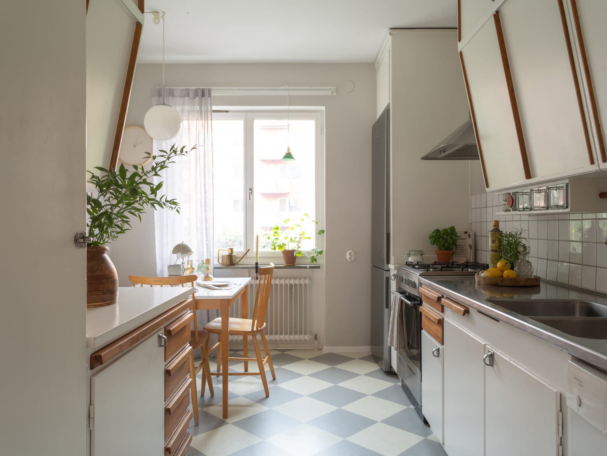 KÖK: Mycket charmigt och tidsenligt kök med sneda köksluckor och schackrutigt golv. Trevlig matplats intill fönstret med fri utsikt över den lugna innergården och dess stora gräsmatta. Köket är utrustat med diskmaskin, spis med gashäll och ugn samt kyl/frys i rostfritt stål.