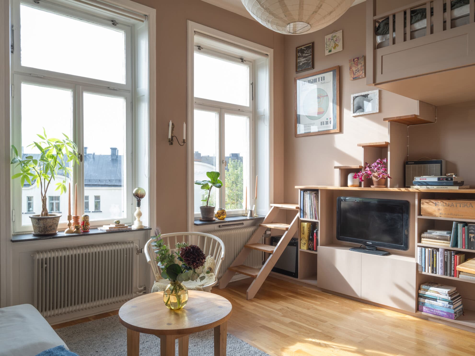 VARDAGSRUM: Ett underbart rum med fantastisk takhöjd och två fina fönster med överglas. Härlig utsikt över allén och Södermalms takåsar. Vacker rosa färg på väggarna skapar ett lugn. Mysigt och tryggt sovloft med plats för 1,20 säng. Fin matplats under sovloftet med platsbyggd soffa. Förvaring ges i inbyggd garderob samt en fristående garderob som även den är snyggt inmålad i samma rosa nyans.