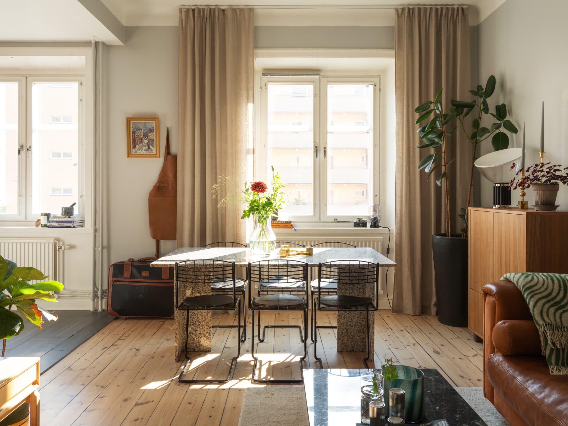 Här finns gott om plats för stor matplats intill fönstret samt mysig soffhörna.