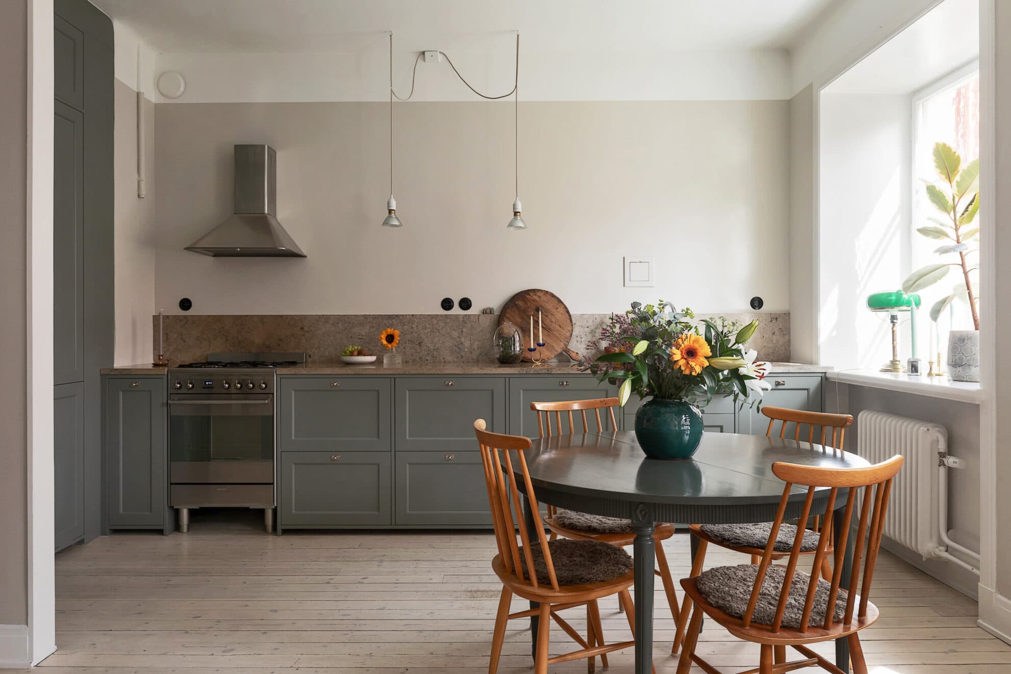 Ljuvligt kök med fin stenskiva och speglade skåp i en behaglig grågrön nyans. Vitvarorna består av kyl/frys, spis med gashäll och varmluftsugn samt diskmaskin. Mycket trevlig matplats intill fönstret.