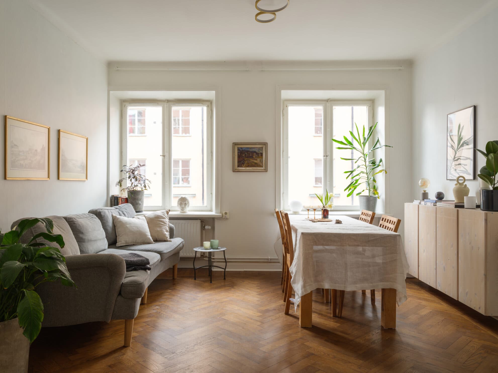 Ett ljust och luftigt vardagsrum med härliga stora fönster som släpper in massor av dagsljus, vilka man möts av direkt man öppnar dörren. Rummet är perfekt för både soffhäng och socialt umgänge. Högt i tak och den vackra fiskbensparketten ger en tidlös känsla som passar både klassiska och moderna inredningsstilar. Här finns plats för både en stor soffa och ett större matbord.