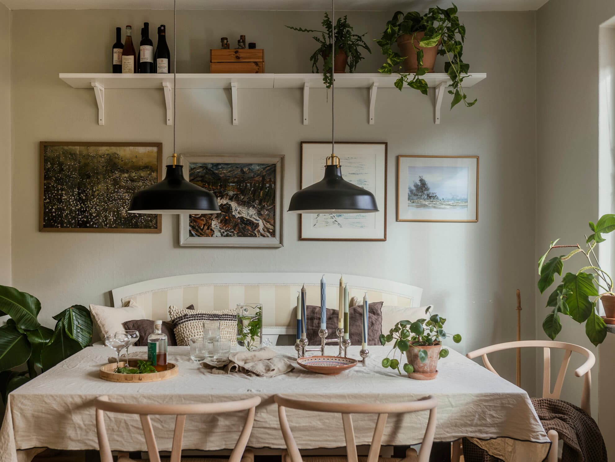Köket är en given plats att samlas och runt det stora härliga middagsbordet kan man duka för många. Köket renoverades 2020 och byggdes om så den öppna och sociala ytan tas väl till vara för gedigna bänkytor samt förvaring. Skåp och lådor har fina speglade fronter med klassiska beslag "Greppa", och köksbänkarna är i ek med vacker diskho i vit porslin. Partiet ovanför arbetsbänken intill spisen är klätt med vitt kakel kring fönstret och hela vägen upp till tak. Kylen/frysen och diskmaskinen är båda snyggt integrerade i inredningen. Väggarna är målade i ljus grågrön ton och golvet belagt med ekparkett.