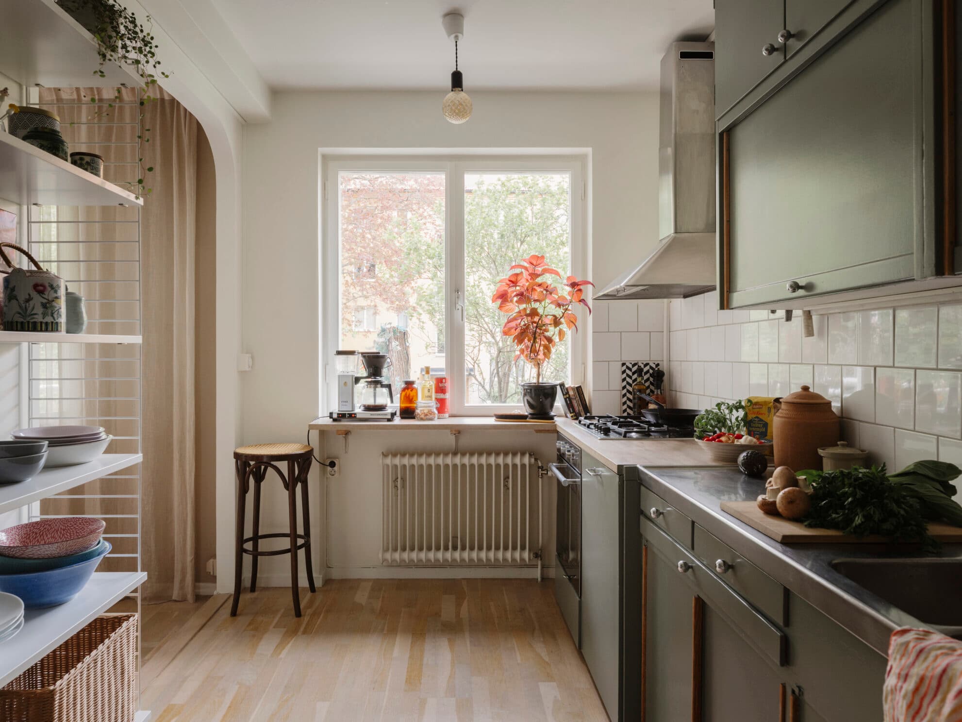 Ett inbjudande och charmigt kök med en härlig känsla av rymd, där fönsterpartiet fyller hela köket med naturligt ljus. Köket vetter mot den rofyllda gården mellan husen, vilket skapar en harmonisk atmosfär. Under 2022/2023 fick köket en smakfull uppdatering – köksluckorna målades i den eleganta nyansen Tall, nytt kakel sattes upp, och en ny bänkskiva lades in. Dessutom installerades en ny gasspis med varmluftsugn, diskmaskin och köksfläkt. Väggarna målades i en varmvit/äggskalston som förstärker den luftiga känslan. Här finns gott om arbetsyta för hemmakocken, med en tålig rostfri arbetsbänk och en praktisk dubbel diskho. Förvaringen är generös, och köket är även utrustat med en kyl/frys. De tidstypiska detaljerna – en vacker fönsterbänk i kolmårdsmarmor och ljus ekparkett på golvet – sätter pricken över i:et.