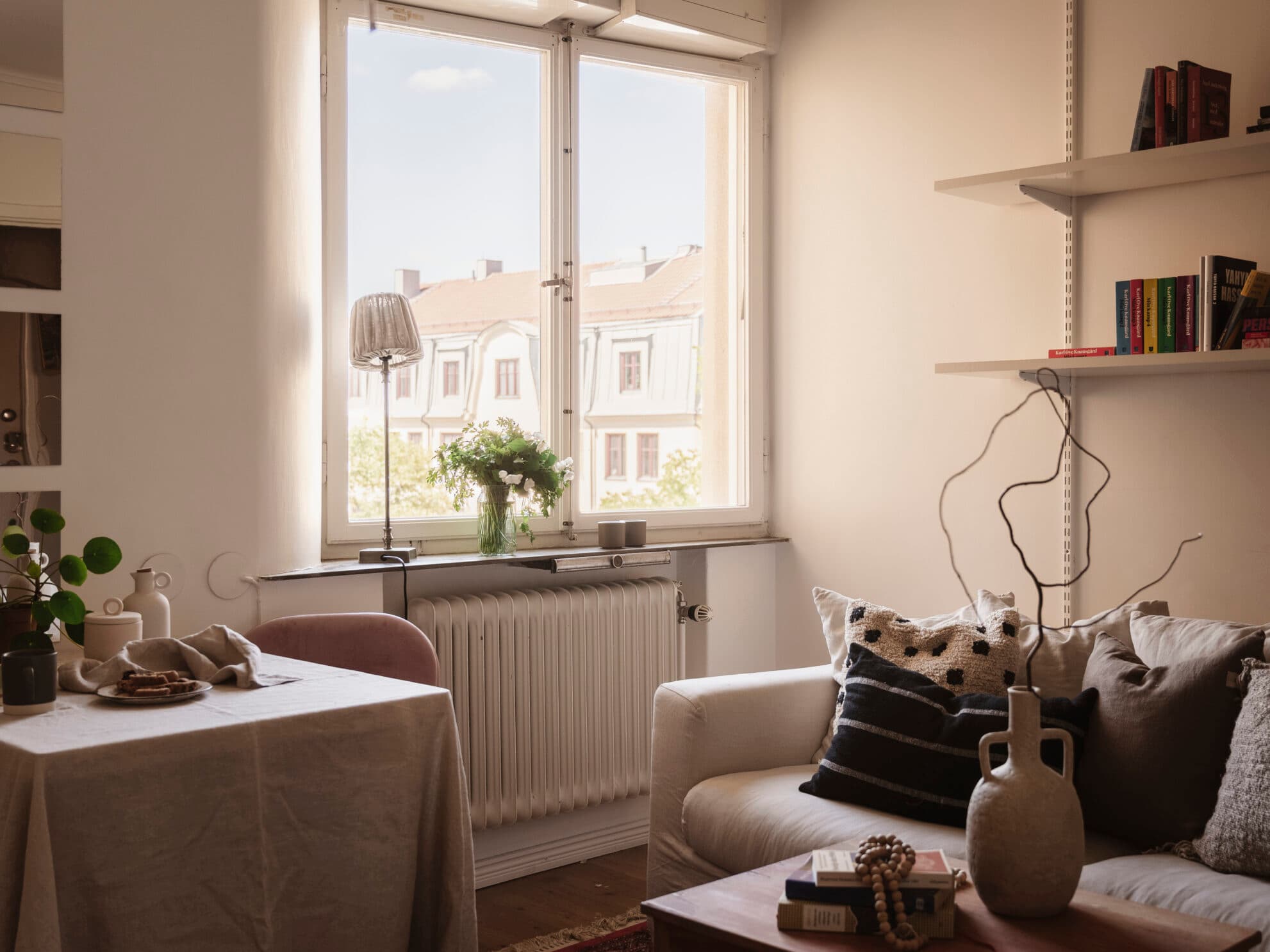 Vackert originalfönster släpper in naturligt ljus och skapar tillsammans med den generösa takhöjden en härlig rymd i allrummet. Här ges gott om plats för säng och soffa och man kan lätt skapa en harmonisk sovdel för att sedan umgås i den bortre delen med soffa och matbord. Det finns gott om förvaringsmöjligheter i en platsbyggd garderob och bakom en dörr gömmer sig även en stor klädkammare. Hela lägenheten målades om 2023 och den platsbyggda garderoben sattes in 2019. Väggarna är målade i vit ton samt klickgolv med vackert åldrad träeffekt i valnöt.
