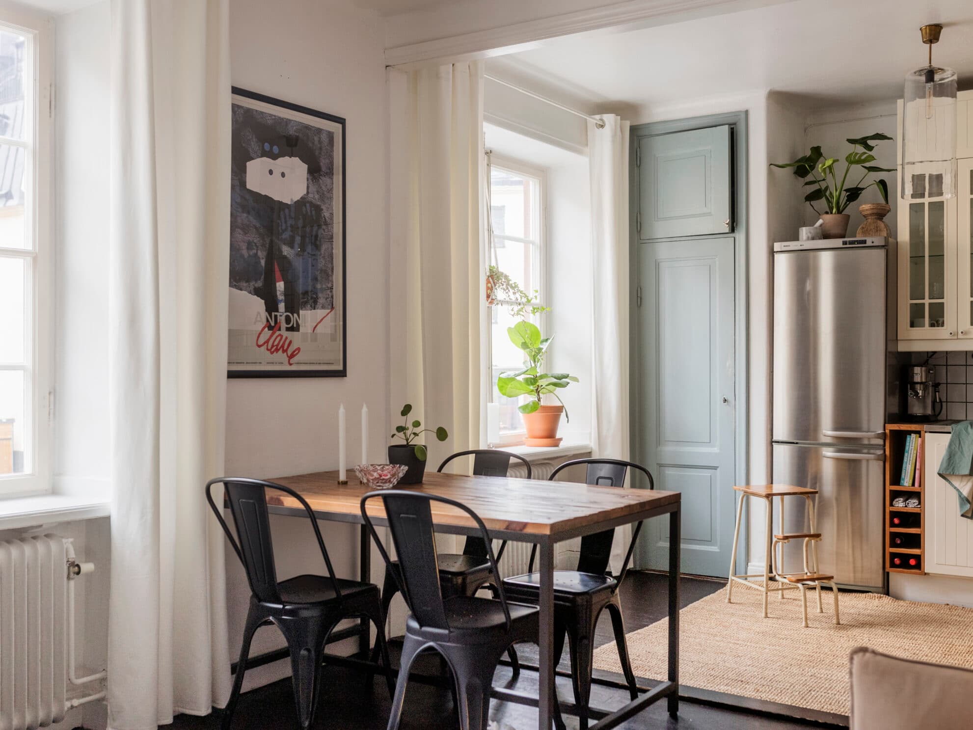 Köket är socialt integrerat med vardagsrummet och komplett utrustat med gasspis och elugn, rostfri kyl/frys och fläkt samt praktisk arbetsbänk i rostfritt stål med dubbel ho. Spröjsade vita köksluckor och retroinspirerad kakelvägg hela vägen upp till tak skapar en tidlös estetik. Det charmiga skafferiet, målat i duvblått, adderar karaktär till köket. Rummet är ljust med stora fönster mot Tegelbruksvägen och djupa fönsternischer som berättar om husets historia. Vita väggar kontrasterar fint mot en fondvägg i grönblå ton, och det mörkbetsade furugolvet skapar en stämningsfull atmosfär. Med gott om plats för både sittgrupp och matbord är det perfekt för avkoppling och långa middagar.