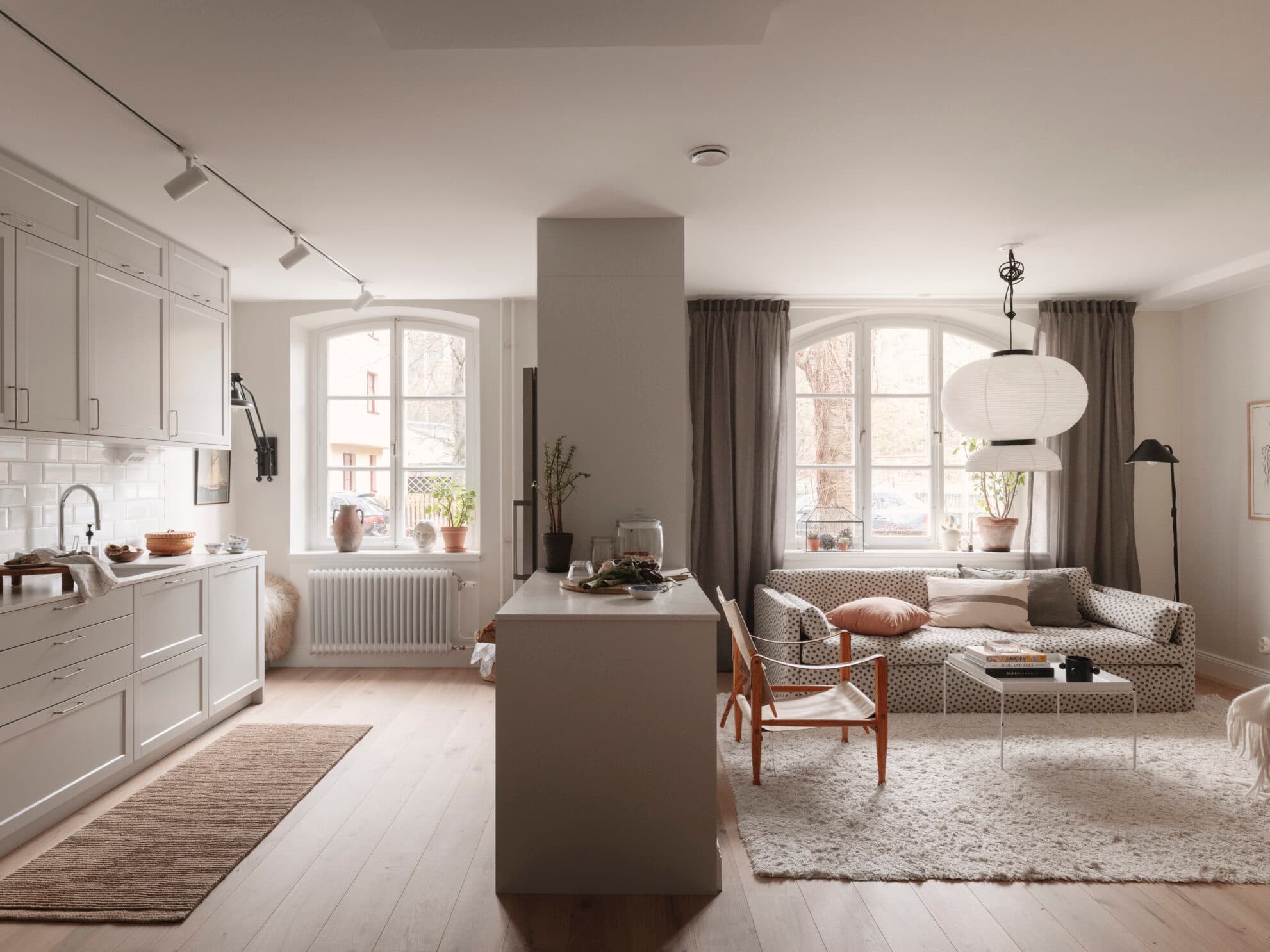 Redan vid första steget in i bostadens sociala del slås man av den generösa rymden och det imponerande samspelet mellan kök och vardagsrum. Takhöjden förstärker känslan av luftighet och bidrar till en inbjudande atmosfär som genomsyrar hela lägenheten. De öppna ytorna erbjuder naturliga samlingspunkter, såsom den skräddarsydda köksön där samtalen flödar, eller den charmiga lilla bänken intill fönstret som gör det enkelt för barnen att delta i köksbestyren. Rummet är både rymligt och flexibelt, med plats för en rejäl matgrupp, en större soffgrupp och annat möblemang. Köket, från Balingslöv, är en dröm i sekelskiftesstil. Här möter klassisk design moderna funktioner. Den ljusgrå kompositbänkskivan ger både stil och hållbarhet, medan de speglade köksluckorna i pärlgrå ton kombinerade med det tidlösa "Biselado"-kaklet skapar ett kök med själ och karaktär. Praktiska detaljer som den integrerade diskmaskinen, inbyggd mikro, varmluftsugnen samt separat kyl och frys höjer funktionaliteten. Här finns gott om förvaring i smarta lådor och skåp hela vägen upp till tak, och stora arbetsytor gör detta till hemmakockens paradis. De spröjsade, djupa fönstren fyller både köket och vardagsrummet med naturligt ljus och berättar subtilt om husets historia. Väggarna, målade i den mjuka nyansen "Sommarsnö", harmonierar vackert med den breda parketten i ek och skapar en stämningsfull och ombonad miljö där varje detalj känns genomtänkt och inbjudande.