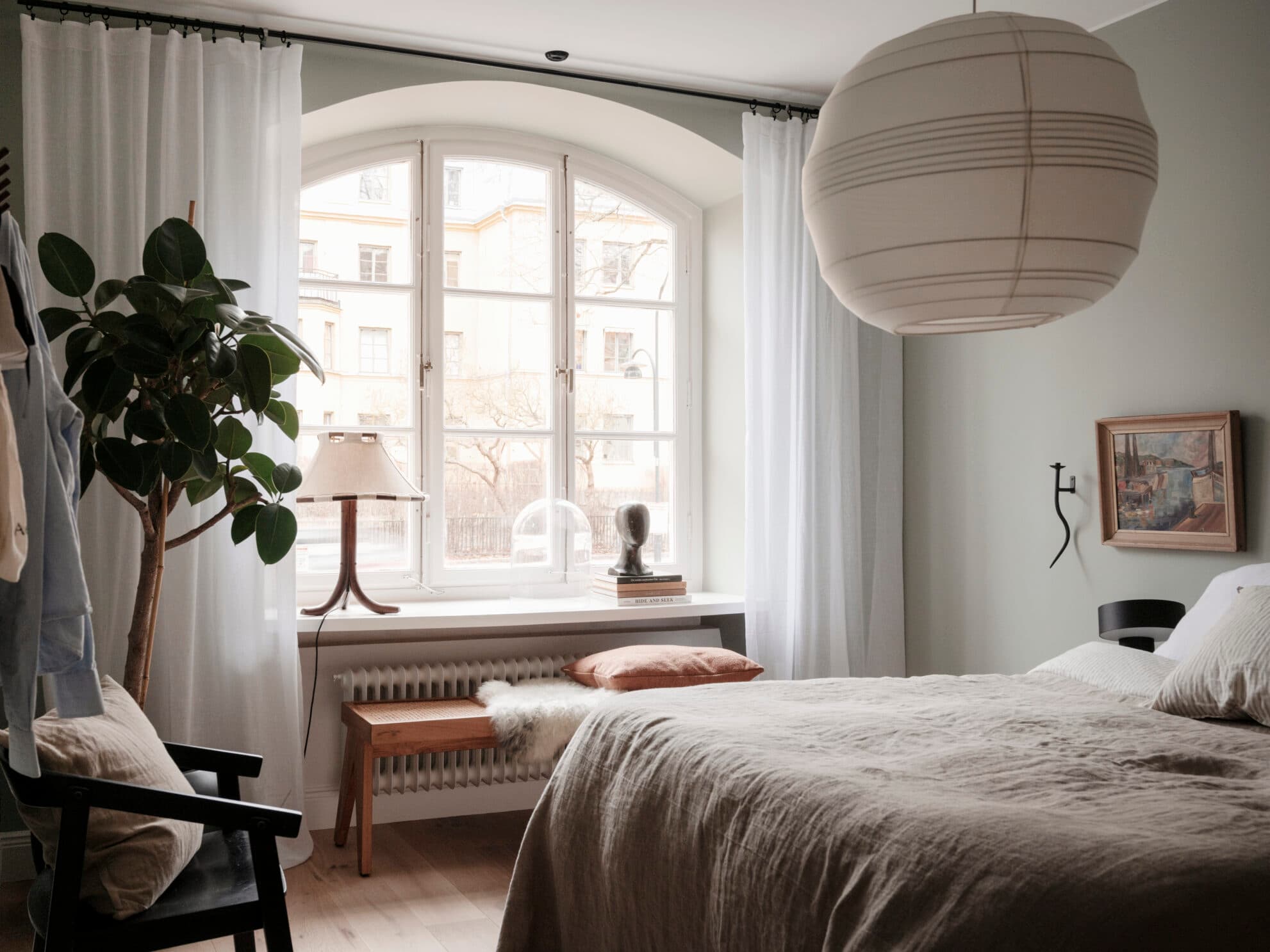 Det andra stora sovrummet, beläget intill vardagsrummet, är perfekt placerat i en mer avskild del av lägenheten. Detta skapar en idealisk miljö för sena middagar med vänner, även efter att barnen gått till sängs. Ett brett spröjsat fönster fyller rummet med mjukt, naturligt dagsljus. Två platsbyggda garderober med eleganta pardörrar erbjuder både praktisk och stilren förvaring. Väggarna är målade i den rogivande gröna nyansen "Sommarregn", som harmonierar vackert med den breda ekparketten.