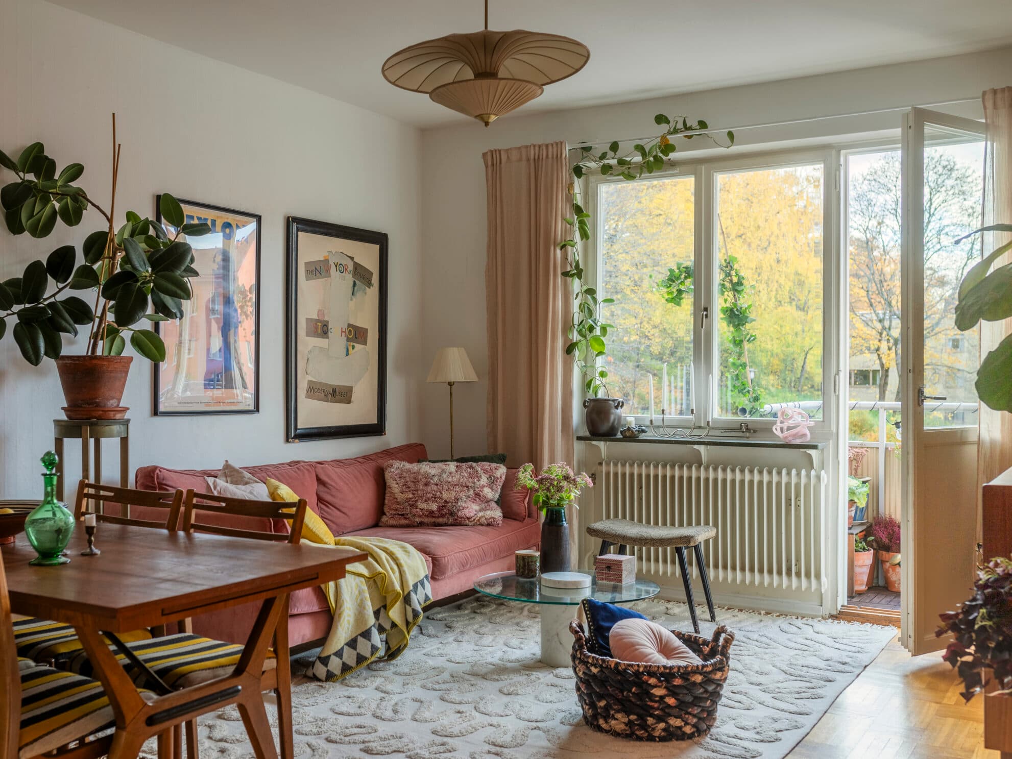 Det breda fönsterpartiet fyller lägenhetens vardagsrum med ljus och genom balkongens öppning i väst lyser solen större delen av dagen och kvällen. Balkongen har härlig utsikt över den lugna gården och alla grönskande träd i skogen precis intill. Rummet är rymligt och det finns plats för både större soffa och matgrupp. Liksom i övriga lägenheten skapar takhöjden en luftig atmosfär. Fönsterbänk i kolmårdsmarmor, målade väggar i vit ton och golvet belagt med vacker originalparkett i holländskt förband. Övriga golv är klädda i elegant, nyinlagd oljad ekparkett från 2018 – en tidlös och hållbar investering som ger en varm och exklusiv känsla till hemmet.