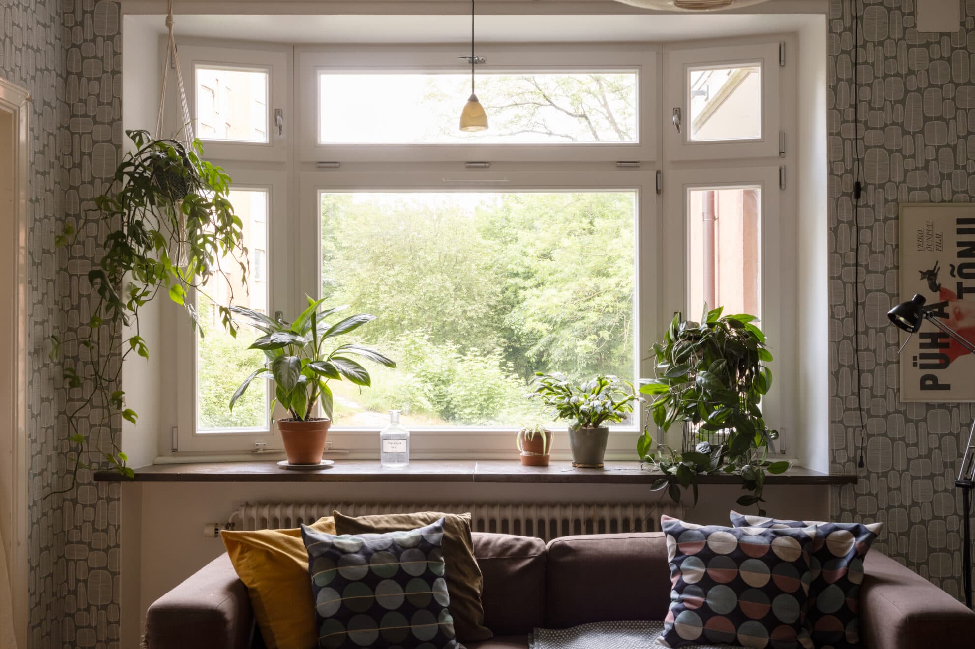 Flera originalfönster i burspråk fyller lägenhetens vardagsrum med ljus och skapar, tillsammans med takhöjden, en härligt luftig atmosfär. Rummet bjuder in till umgänge, och det finns gott om plats för både soffa och matplats. Väggarna är tapetserade och golvet belagt med originalparkett i holländskt förband.
