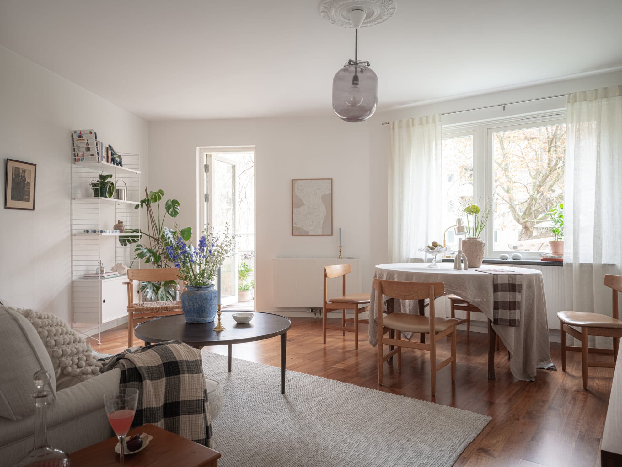 Det rymliga vardagsrummet har en spännande, oregelbunden planlösning med fönster i två väderstreck. Väggarna är målade i vitt, och golvet är belagt med valnötsparkett. Härifrån nås lägenhetens balkong, som vetter mot den slutna innergården och erbjuder sol från morgon till tidig eftermiddag.
