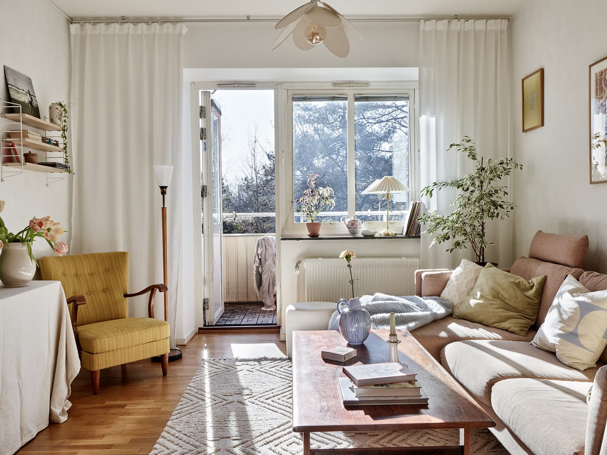 Fönstren i sydväst fyller lägenhetens vardagsrum med ljus och under sommarhalvåret har balkongen härlig eftermiddags- och kvällssol. Rummet är lättmöblerat och det finns plats för exempelvis soffa, TV-bänk, läsfåtölj, skrivbord och bokhylla. Väggarna har vit tapet och originalparkett löper tröskelfritt genom öppningen mot hallen.