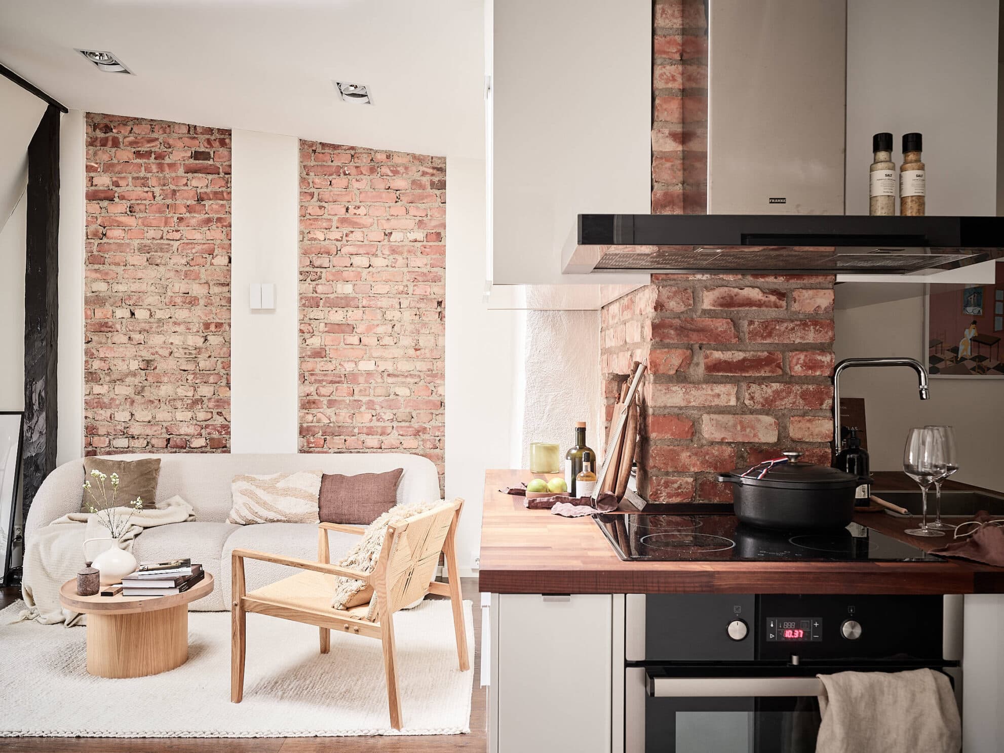Lägenhetens vardagsrum och kök är i enhet i en halvöppen, luftig och social planlösning med plats för både soffgrupp och matbord. Dagsljuset strömmar in genom takfönstret och den vackra takkupan med spröjsat fönster. Vid takkupan finns en fin sittbänk med förvaringsutrymme. Väggarna är vitmålade och enstavsparkett i mörk ek löper tröskelfritt genom ingången till sovrummet. De betsade takbjälkarna, frilagda tegelpartierna och fina dekorstenarna vid rummets putsade stenvägg är charmiga inslag. Ljussättningen ger stenväggen ett väldigt fint ljus på kvällarna och under vinterhalvåret. Köket följer murstocken på ett tilltalande sätt som även maximerar arbetsytan, och tack vare öppningen mot vardagsrummet kan matlagningen kombineras med umgänge. Köksbänken är i massiv valnöt med infälld spishäll och diskho. Ugnen, fläkten och kylen/frysen är i rostfri design medan diskmaskinen är integrerad i den vita köksinredningen. I en nisch i murstocken har en mikro installerats.