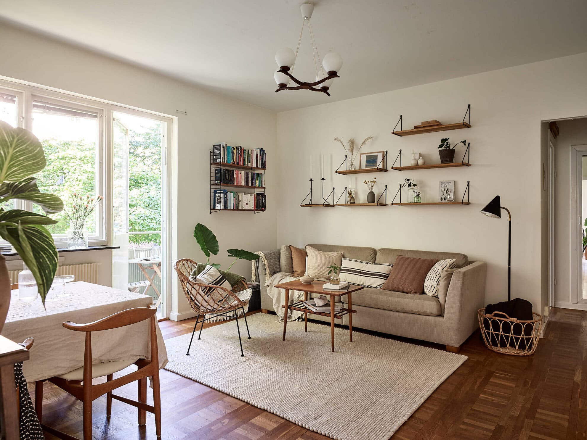Lägenhetens vardagsrum erbjuder flera möbleringslaternativ, och det finns plats för både soffa och matgrupp. Under sommarhalvåret är balkongen i soligt västerläge en underbar förlängning av rummet, och här njuter man av mysigt gårdslugn. Den lummiga grönskan utanför balkongen ger en rogivande känsla. Rummets väggar är målade i brutet vitt och golvet belagt med oljad originalparkett i holländskt förband.