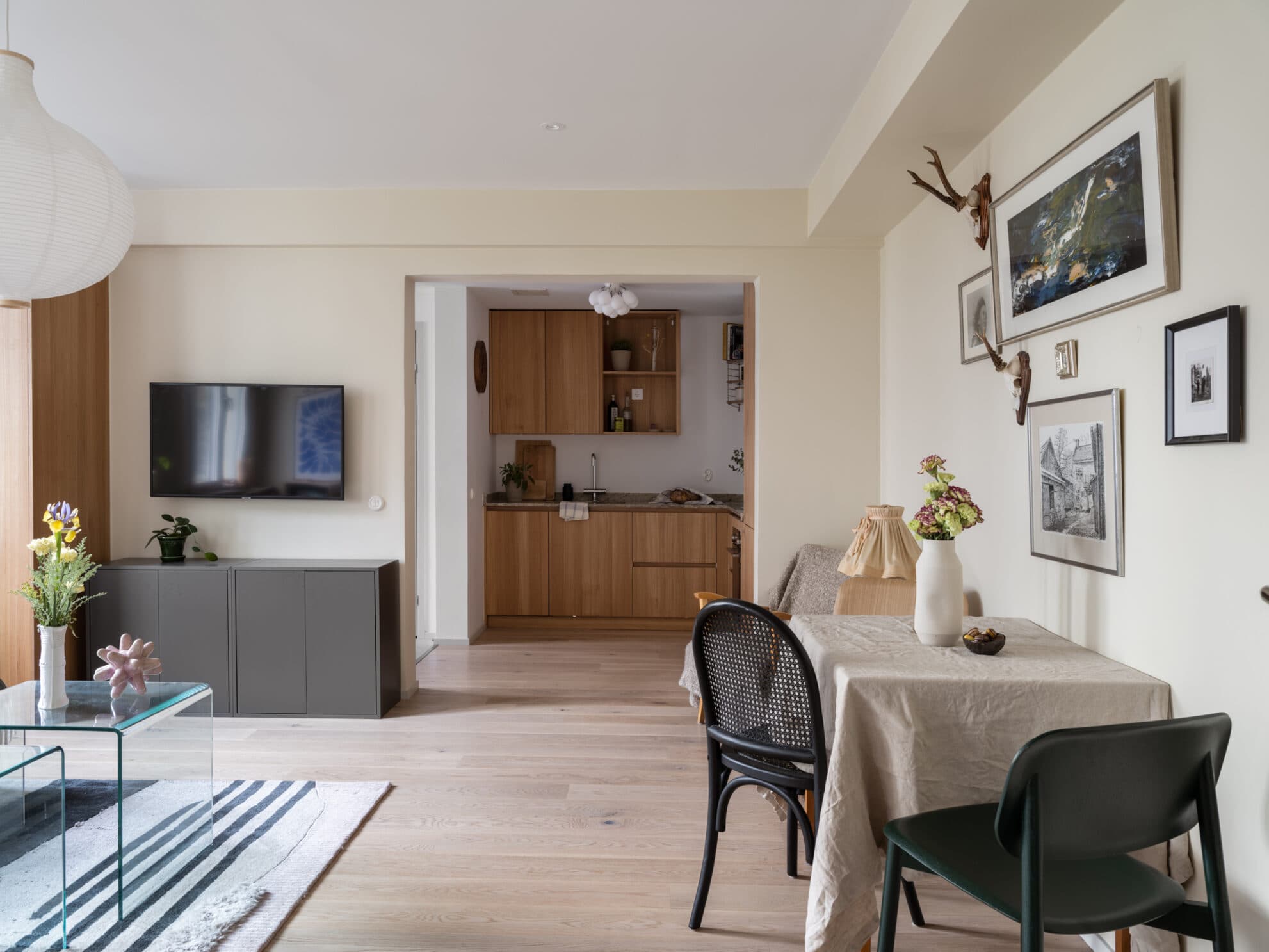 Lägenhetens vardagsrum och kök är i enhet i en öppen och luftig planlösning med härligt ljusinsläpp från två fönster mot en grönskande innergård. Planlösningen bjuder in till umgänge och i vardagsrummet finns det gott om plats för både soffa och matgrupp. Bra förvaringsmöjligheter erbjuds i form av en Kvänumgarderob i Alm. Rummets väggar är målade i ljusbeige och golvet belagt med hårdvaxoljad enstavsparkett.