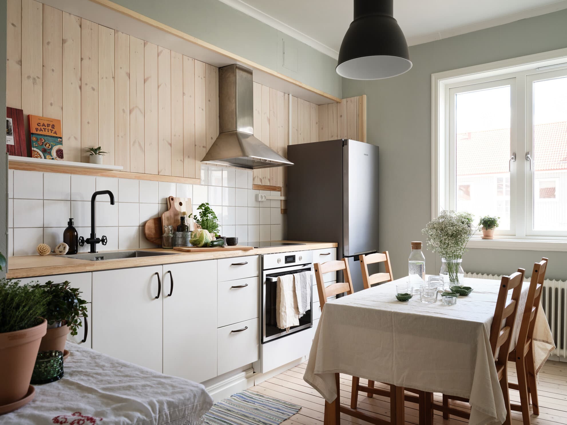 Köket, med utsikt över kvarterets grönskande innergård, är rymligt och här kan man duka upp till trevliga middagar i goda vänners lag. Det är väl tilltaget med arbetsyta och den långa köksbänken är i massivt trä med infälld spishäll och diskho. Partiet ovanför bänken är klätt med vitt kakel. Det finns även gott om förvaring och den bevarade originalinredningen – serveringsskåp och skafferi – är ett charmigt inslag. Köksskåpen är vita medan ugnen, fläkten och kylen/frysen är i rostfri design. Alla vitvaror sattes in i samband med renoveringen av köket 2021. Brädgolvet är framtaget och väggarna, inklusive kökets vackra originalspont, målade i ljusgrönt.