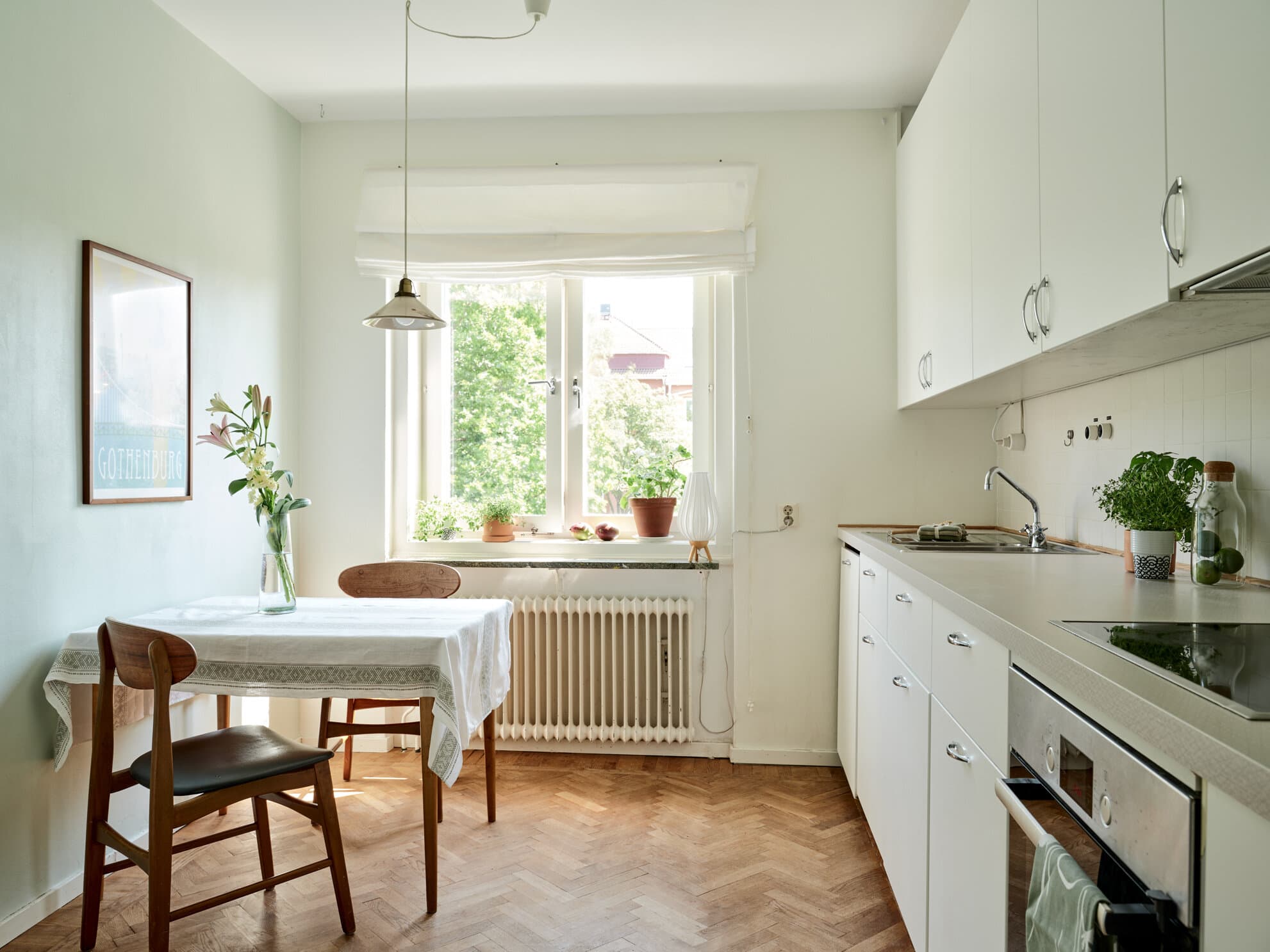 Morgonsolen strålar in i köket och från fönstret har man en fin vy över innergården och en av kvarterets lekplatser. Köket bjuder in till både matlagning och umgänge, och det finns plats för att duka upp till trevliga middagar i goda vänners lag. Till vardags ryms ett matbord för fyra personer lätt och ledigt. Hemmakockarna har bra svängrum och den virrvarrmönstrade köksbänken, med infälld spishäll och diskho, sattes in 2021. Partiet ovanför bänken är klätt med grått kakel. Det är även väl tilltaget med förvaring och 2020 fräschades köket upp med nya luckor och lådor från Härjedalskök. Stommarna, ugnen, fläkten och kylen/frysen sattes in 2017. Väggen vid fönstret är vitmålad och i övrigt är köket målat med en ljusgrön färg. Golvet är belagt med fiskbensparkett i ek.