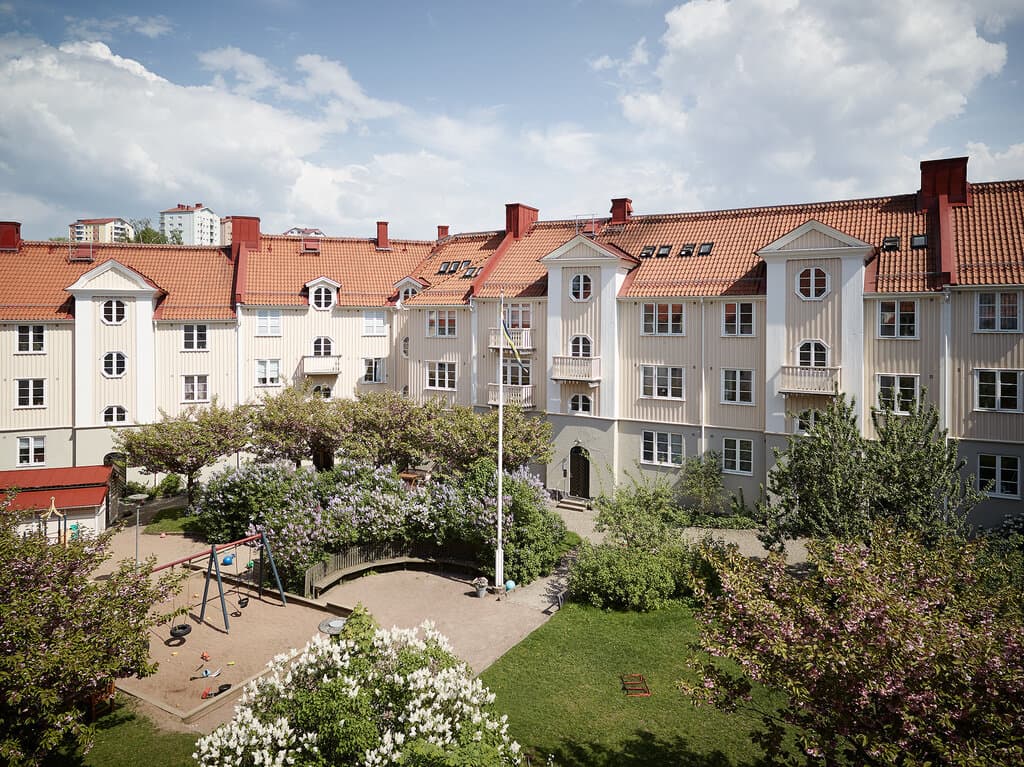 Det är ett så kallat storgårdskvarter och den stora innergården har gammaldags gatsten och härlig grönska i form av buskar, träd och gräsmattor. Här finns cykelställ, gemensamma trädgårdsmöbler, lekplats och förråd för förvaring av cyklar, barnvagnar och leksaker. Det är en välskött bostadsrättsförening med mycket trevlig stämning grannar emellan, och förutom en fantastisk utemiljö har de boende även tillgång till faciliteter såsom snickarrum, återvinningsrum, lekrum med pingisbord, ett flertal tvättstugor och en gästlägenhet som man kan hyra när man får långväga besök.