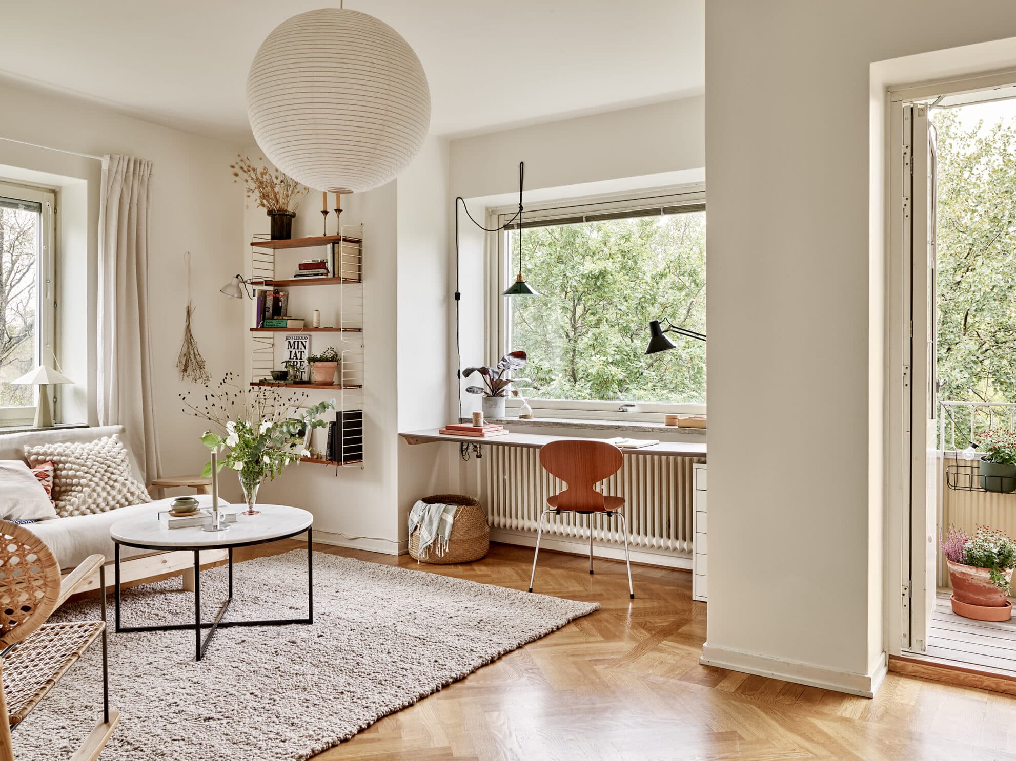 Vardagsrummet är ett underbart hörnrum med fantastiskt ljusinsläpp från fönster i söder och väster. Under sommarhalvåret har balkongen i väster många härliga soltimmar. Rummet bjuder in till umgänge, och en stor soffgrupp ryms lätt och ledigt. Fönsternischen passar perfekt som en matplats där man kan duka upp till trevliga middagar i goda vänners lag. idag finns här ett platsbyggt skrivbord för den som arbetar hemifrån. Väggarna är vitmålade och golvet belagt med fiskbensmönstrad originalparkett.