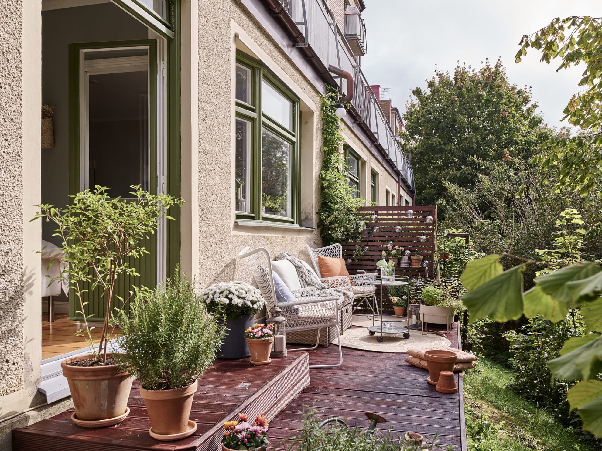 Från vår till höst är uteplatsen en underbar förlängning av lägenheten, och här njuter man av solen från tidig eftermiddag till sen kväll. Titt som tätt kan man skymta rådjur kika fram i skogsdungen strax nedanför. Det finns gott om utrymme för både möbler, grill och krukväxter, och i det illa växthuset nedanför köksfönstret odlas kryddor och grönsaker.