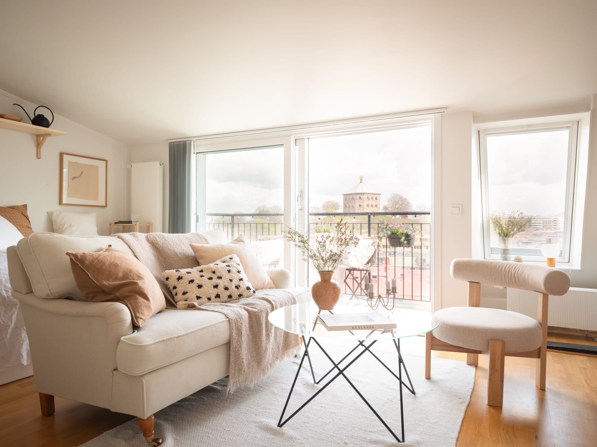 Vardagsrummet och köket är i enhet i en öppen planlösning med fantastiskt ljusinsläpp från terrassen och dess helglasade skjutdörr. Den hänförande utsikten över takåsarna bort mot stadskärnan ger en underbar frihetskänsla. Det finns gott om plats för säng, matbord, soffa och TV-bänk, och utmärkt förvaring för kläder med mera erbjuds i form av inbyggda garderober. Väggarna är vitmålade, och askparkett löper tröskelfritt genom öppningen mot hallen.