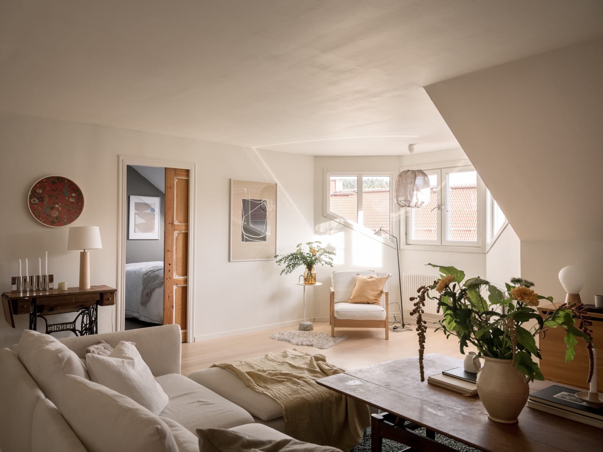 Även här uppe har ytan nyttjats för att skapa två sovrum. Ett av dem används idag som master bedroom och inrymmer en stor dubbelsäng samt garderober. Här sover ni gott under takfönstret med stjärnhimlen som utsikt.