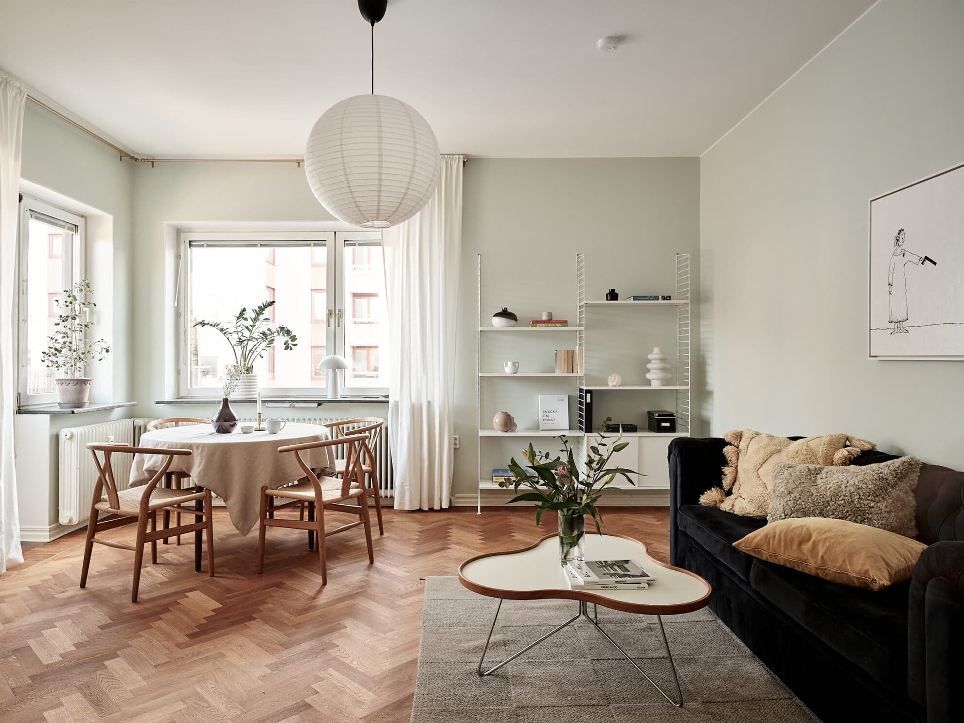 De stora fönstren fyller lägenhetens vardagsrum med ljus och här når ni den härliga hörnbalkongen. Från balkongen ser ni den ståtliga Masthuggskyrkan resa sig över omgivningen. Rummet är lättmöblerat och man får enkelt plats med både soffa och matgrupp. Golvet pryds av en vacker slipad fiskbensparkett i original som löper tröskelfritt genom öppningen mot hallen. Väggarna är målade med ljus gröngrå kulör som framhäver harmonin i lägenheten.
