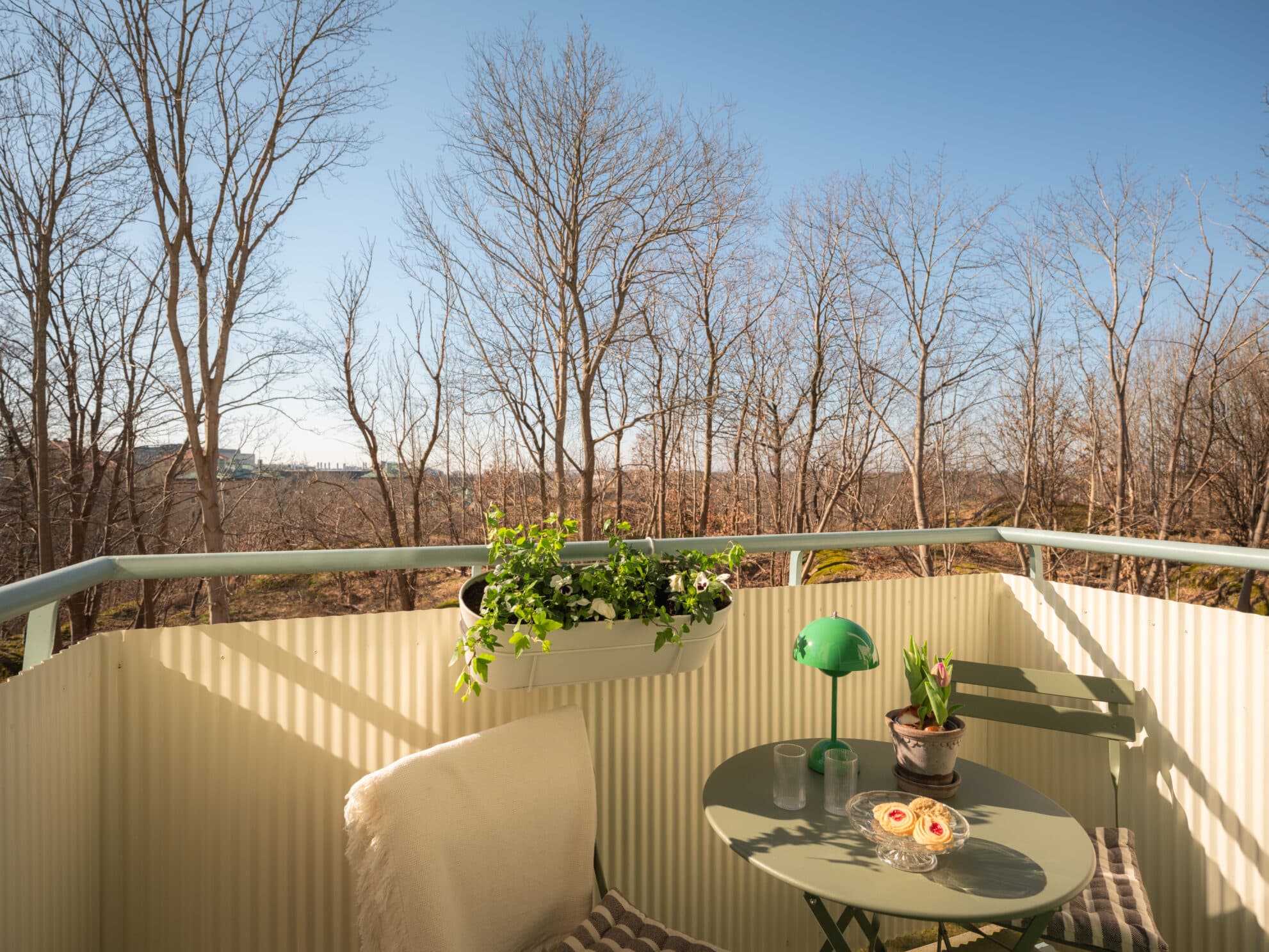 Lägenhetens hörnläge samt fönster i två väderstreck skapar ett underbart ljusspel under dagens timmar. Härifrån blickar man ut mot grönskan i området och även ut mot Göteborgs innerstad. Den södervända balkongen ligger insvept i grönska sommartid, en perfekt plats för morgonkaffet eller långa kvällar i solen. Rummet präglas av tidstypiska detaljer som holländskt förband i originalparketten och målade väggar som låter ljuset flöda fritt.