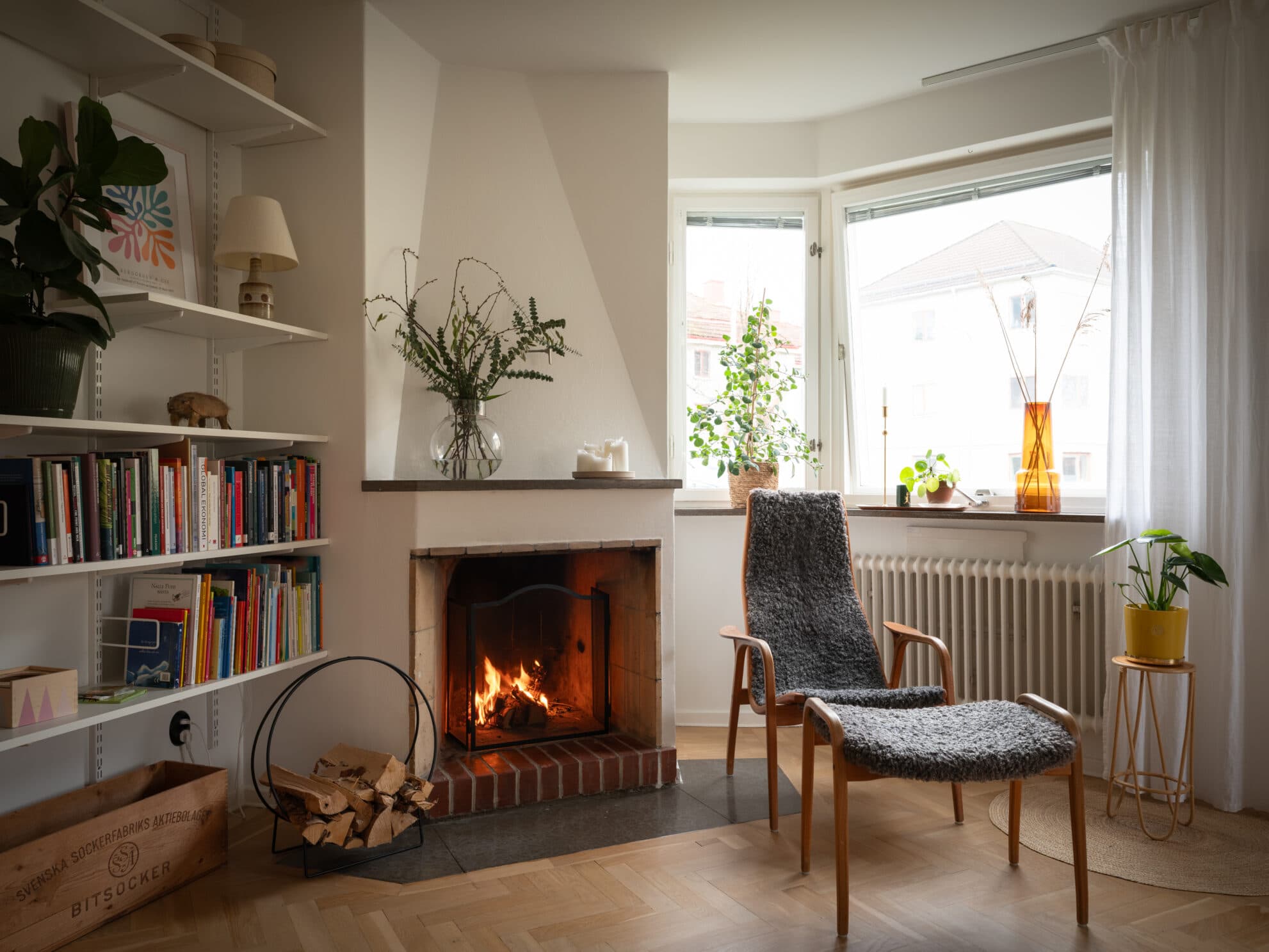 Burspråket vid husets gavel ger vardagsrummet karaktär. Tack vare fönster i två väderstreck badar rummet i ljus, och när skymningen väl fallit är det mysigt att elda i den vackra öppna spisen som ståtar i ett av hörnen. Det är ett väldimensionerat rum med gott om utrymme för soffa, TV-bänk, läsfåtölj med mera. Den platsbyggda bokhyllan är en fin inredningsdetalj. Golvet är belagt med fiskbensmönstrad originalparkett och rummets väggar är målade i vitt.