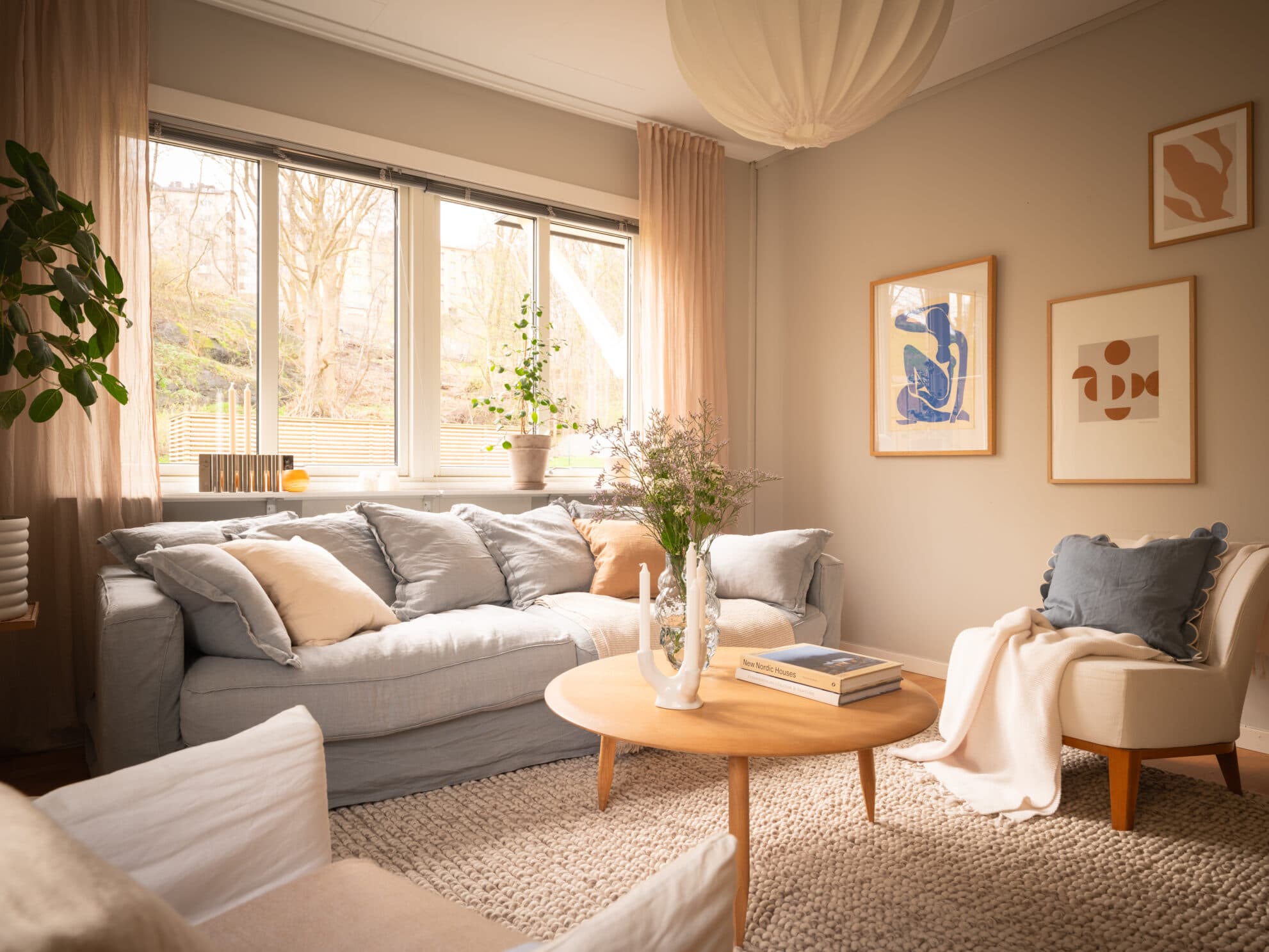 I vardagsrummet dansar dagsljuset in från fönster två väderstreck och skapar en känsla av rymd och öppenhet. Här får den stora soffan plats, tillsammans med tv-möbel och fåtöljer. Väggarna målades 2023 i en gråbeige ton som matchas fint mot golvparketten. Stora fönsterpartier ger utsikt över den grönskande trädgården.