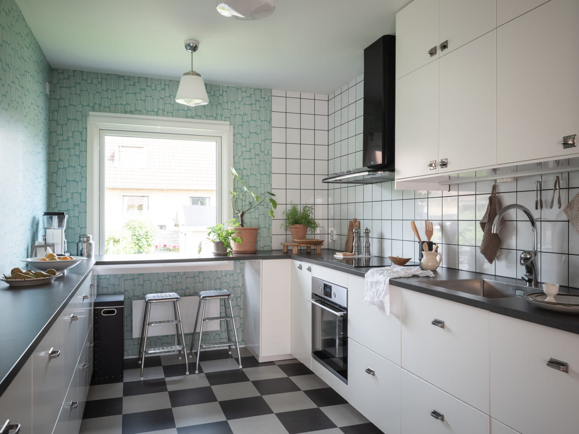 I köket är det väl tilltaget med både arbetsyta och förvaring, och tack vare den öppna planlösningen kan matlagningen kombineras med umgänge. Takhöjden tas tillvara genom dubbla rader överskåp. Skåpen har vita luckor och lådor med beslag i funkisstil från Byggfabriken, och bänkskivorna är i mörkgrått laminat. Partiet ovanför bänken med spishäll och diskho är klätt med vitt kakel. Under bänken vid fönstret kan man placera ett par kökspallar. Ugnen är i rostfri design medan dismaskinen och kylen/frysen (side-by-side) är integrerade i inredningen. Alla vitvaror, inklusive den stiliga fläkten från Franke, sattes in i samband med att köket färdigställdes 2017. Köket har schackrutigt Marmoleumgolv och väggarna är tapetserade med en retrotapet från Midbec.