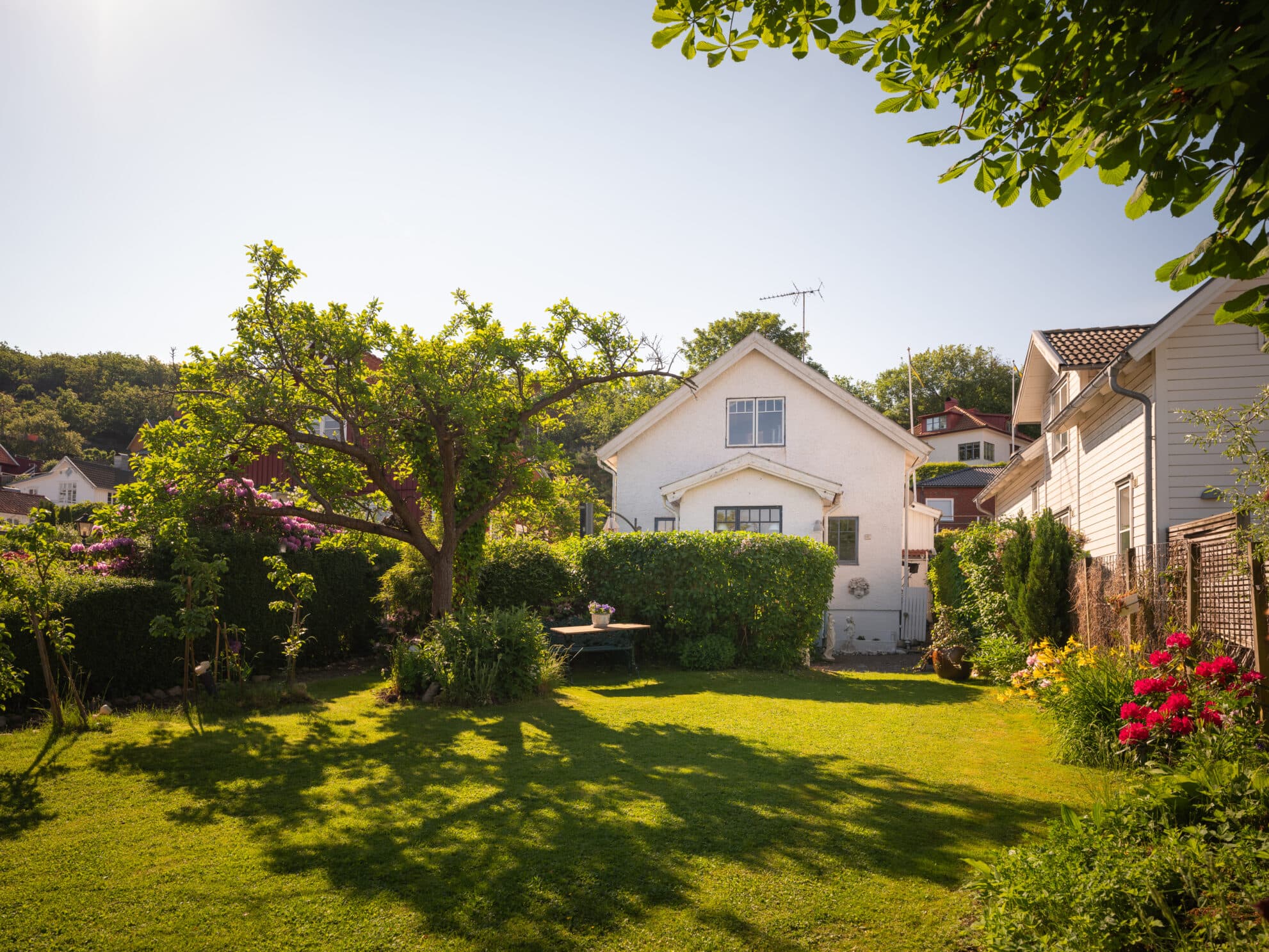 Huset har en härlig trädgård med uppväxta träd, buskar och häckar som ger en lummig inramning. Perennrabatterna står i fägring hela säsongen, och rhododendron är grön året om. Tack vare altaner i olika lägen kan man följa solen, och här bjuds det in till såväl avkoppling som till trevliga grillkvällar i goda vänners lag. Det finns även finfina gräsytor för kubbspel, krocket och lek med barnen. Gångar i gatsten och rullsten ger miljön en charmigt ålderdomlig karaktär.