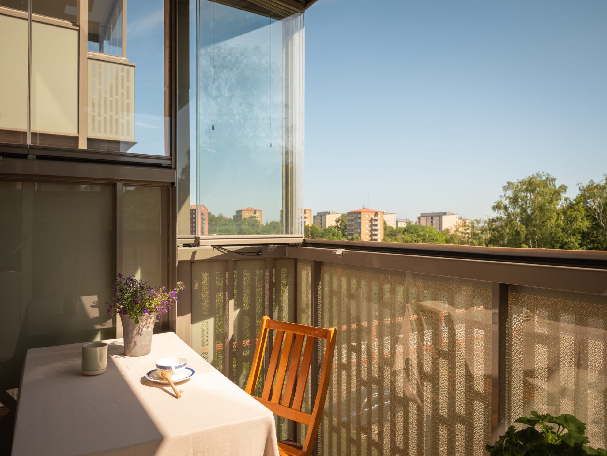 Från köket når man lägenhetens inglasade och cirka 5 kvm stora balkong. Från tidig vår till sen höst är balkongen ett underbart extrarum och här njuter man av den fria utsikten över Guldhedsdalens grönska. Solen är här från morgonen fram till lunch.
