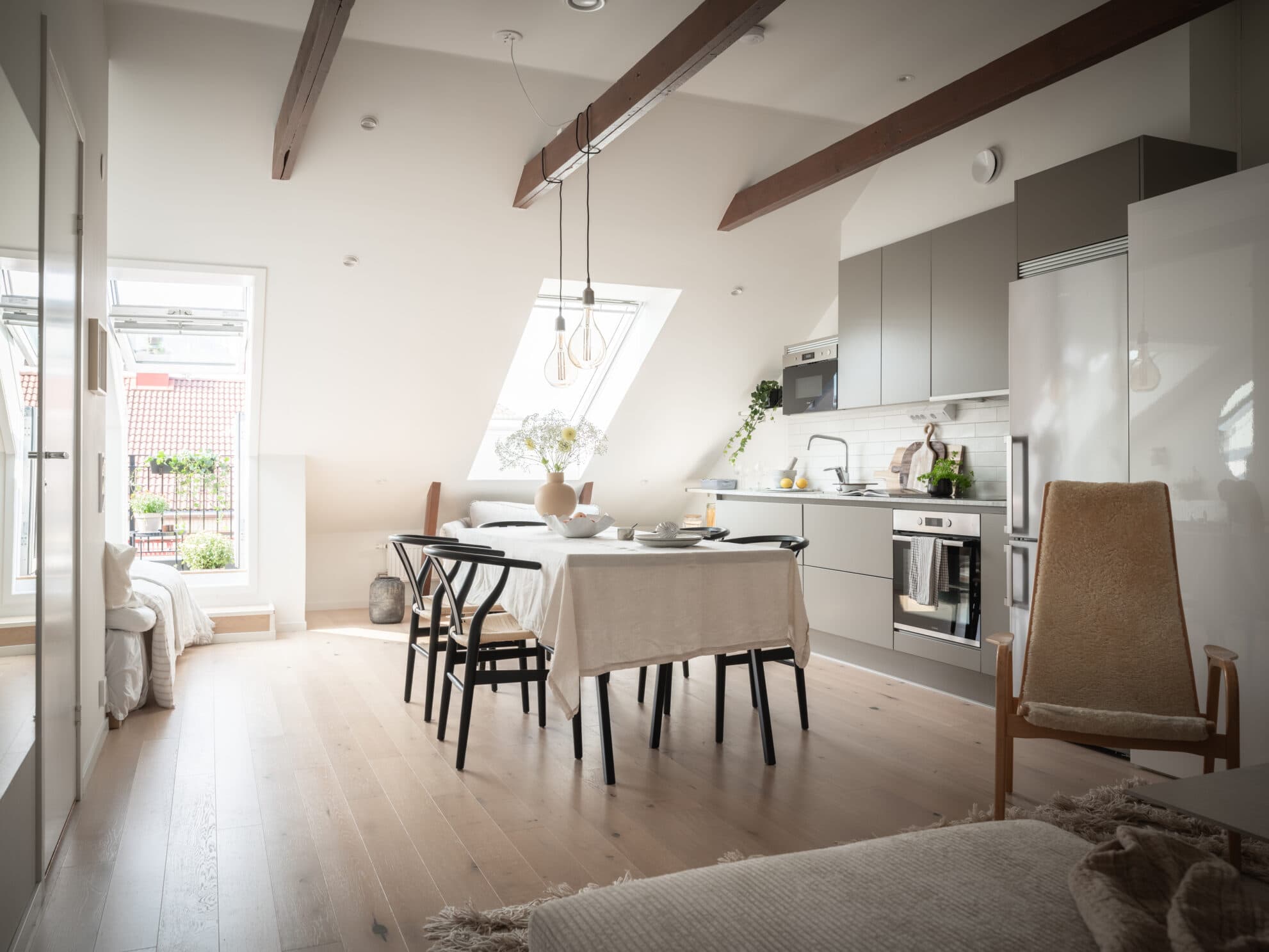 Högst upp i huset välkomnas ni in i denna unika vindslägenhet som disponeras över ca 53 kvm i golvyta, fördelat på 1,5 rok med en praktisk sovalkov. En solig balkong med milsvid utsikt i västerläge förlänger bostaden under sommartid. Ett rikligt ljusinsläpp från fönster i motsatta väderstreck fyller hemmet med dagsljus, och den generösa takhöjden upp till nock ger ännu mer rymd. Detta är ett hem med hög standard och noga utvalda färg- och materialval, med ett kök från HTH, vacker ekparkett i ljust utförande och ett helkaklat badrum med golvvärme. Välkomna till ett hem utöver det vanliga!