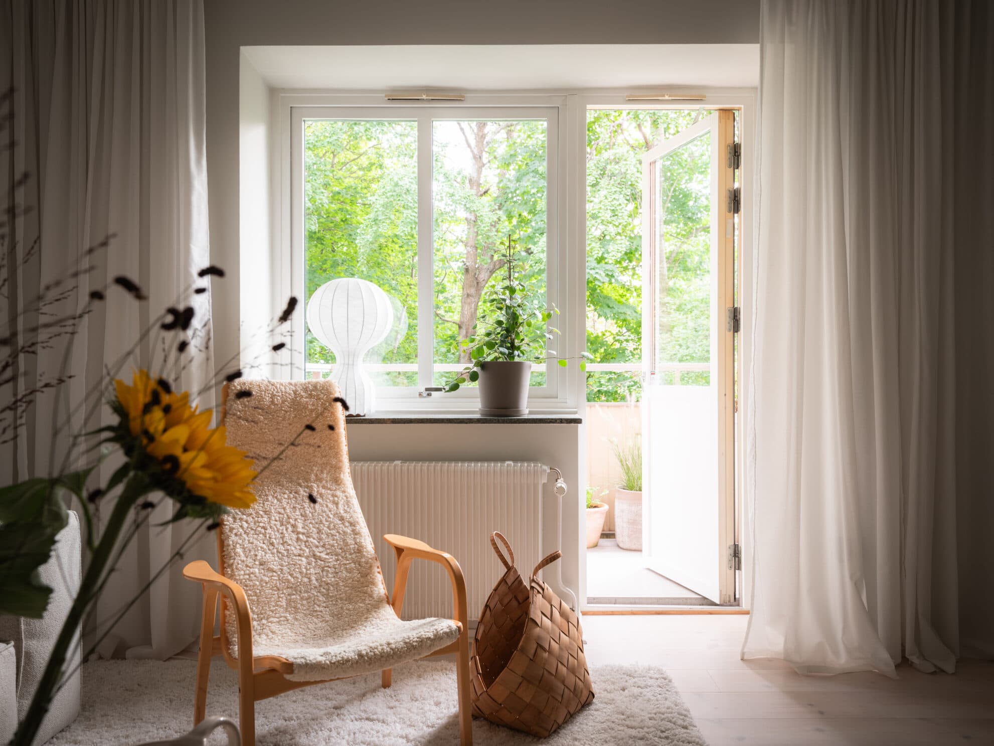 Ljuset flödar vackert genom vardagsrummets stora fönster och skapar en luftig och trivsam atmosfär. Väggarna är målade i den mild ton från Beckers, stjärnstoft, vilket ger en ljus och harmonisk känsla. Färgen återfinns i hela lägenheten utom i köket, NCS S 1002-Y. Det nylagda parkettgolvet i vitlaserad ek, lagt 2020, ger rummet en modern och elegant touch. Den generösa takhöjden på 2,70 meter förstärker rymden och gör rummet lätt att möblera. Den platsbyggda bokhyllan, som färdigställdes och målades 2023, ger extra charm och medföljer vid köpet – perfekt för den bokälskande köparen.