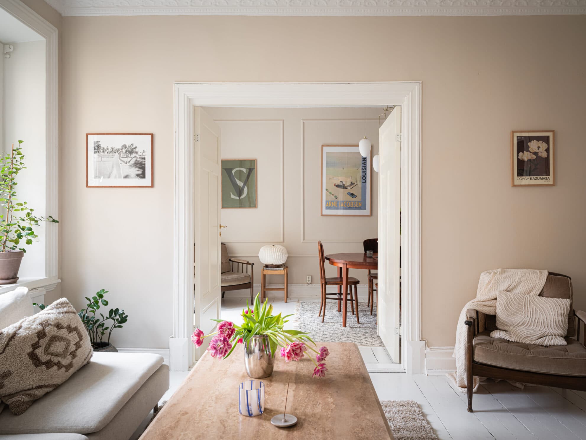 Det vackra vardagsrummet andas sekelskifteskaraktär och bjuder på en känsla av rymd och elegans tack vare den generösa takhöjden och väggar i en ljus, tidlös ton. Rummet ramas in av ståtlig stuckatur och en vackert dekorerad takrosett som påminner om byggnadens historiska charm från sent 1800-tal. Här finns två stora, djupa fönster som låter dagsljuset flöda in och skapa ett naturligt, inbjudande ljusspel över rummets detaljer. Fönstren vetter mot den gröna innergården, vilket ger en lugn och harmonisk utsikt, samtidigt som insynen är minimal.