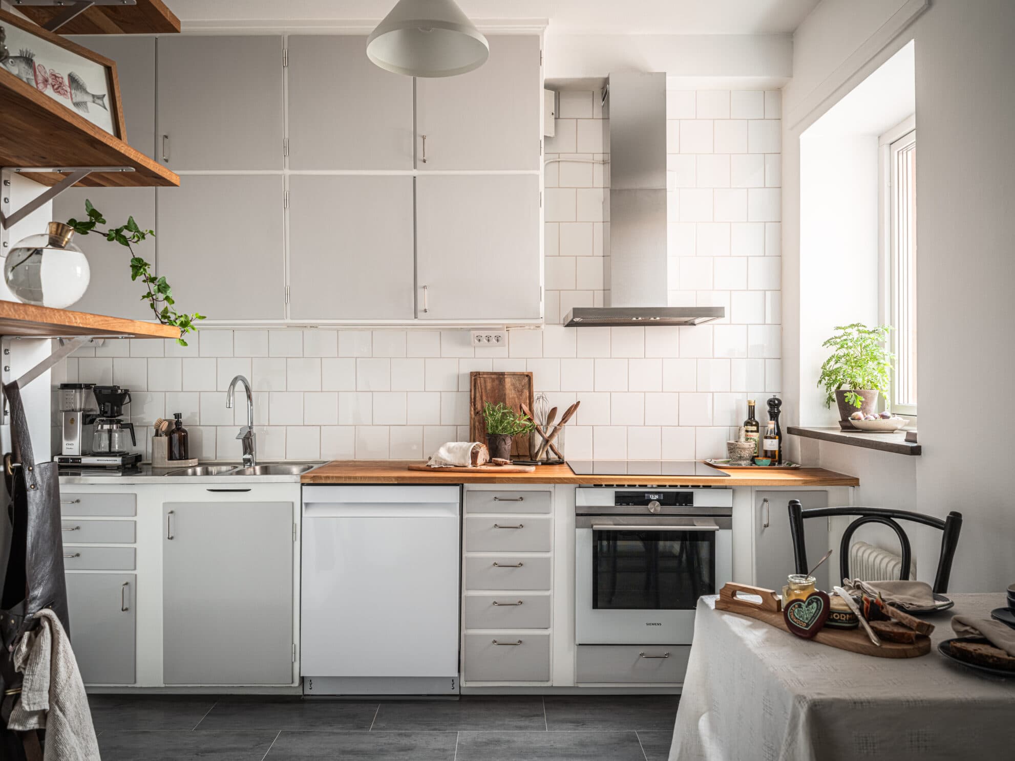 Det charmiga köket kombinerar originaldetaljer med moderna uppdateringar. Väggarna är målade i vitt (2021), och det grå laminatgolvet matchar snyggt med de vita kakelplattorna ovanför arbetsbänken. Här finns också möjlighet att ta fram ett trägolv om så önskas. Köket är välutrustat med nya vitvaror: diskmaskin från Samsung (2021-2022), spis från IKEA (2022) och en ugn från Siemens (2022), medan kyl och frys kommer från Electrolux. Bänkskivorna i ek och metall ger en rustik och stilren känsla. Renoveringar gjordes 2022, då stommen och dörrarna målades om och en ny bänkskiva samt kakel installerades.