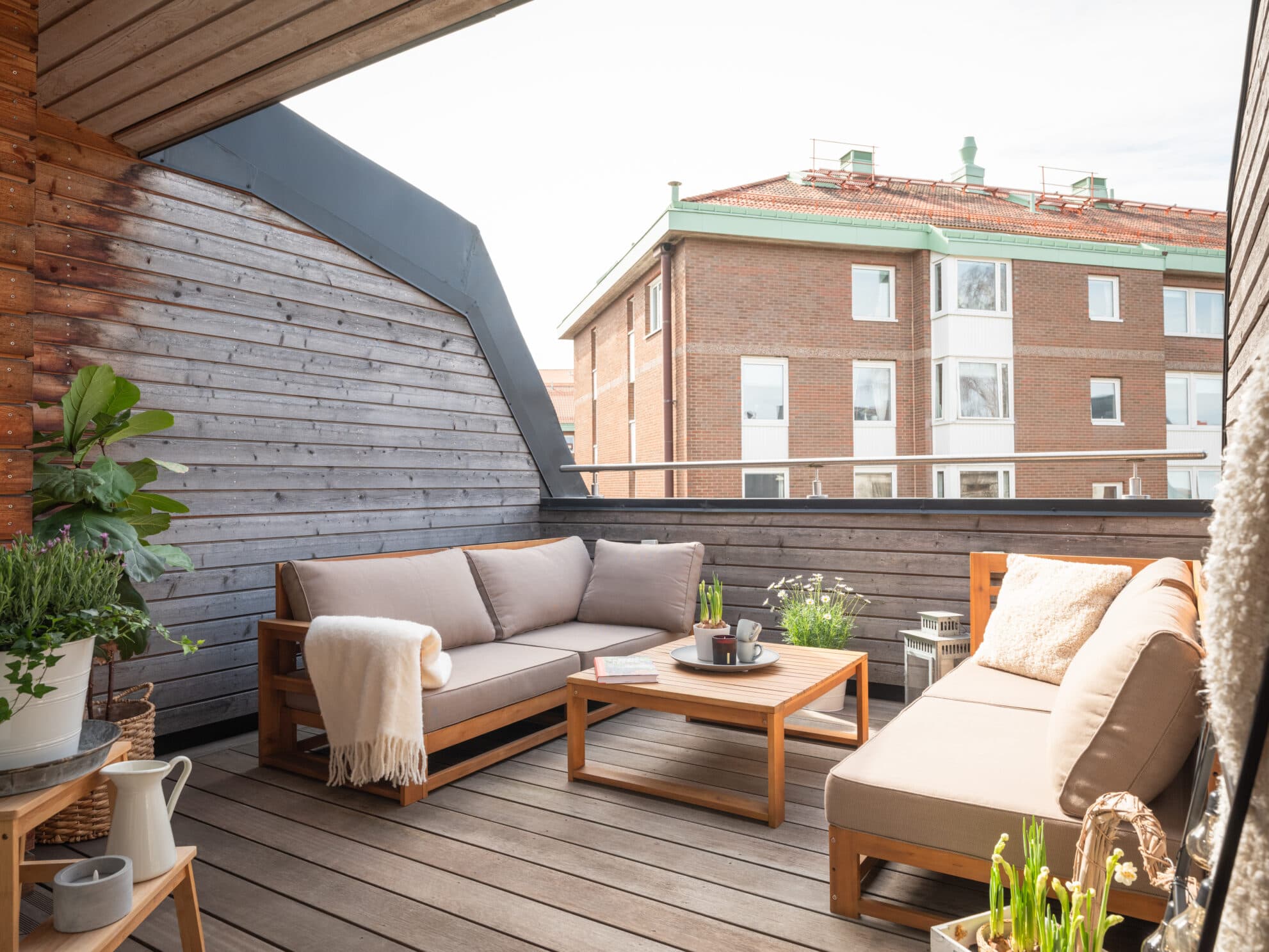Den stora takterrassen i västerläge förlänger vardagsrummet under årets varmare månader. Här finns gott om plats för både loungegrupp och matmöbler. Solen dröjer sig kvar långt in på kvällen, och solnedgångarna över kvarterets takåsar är en njutning att beskåda.