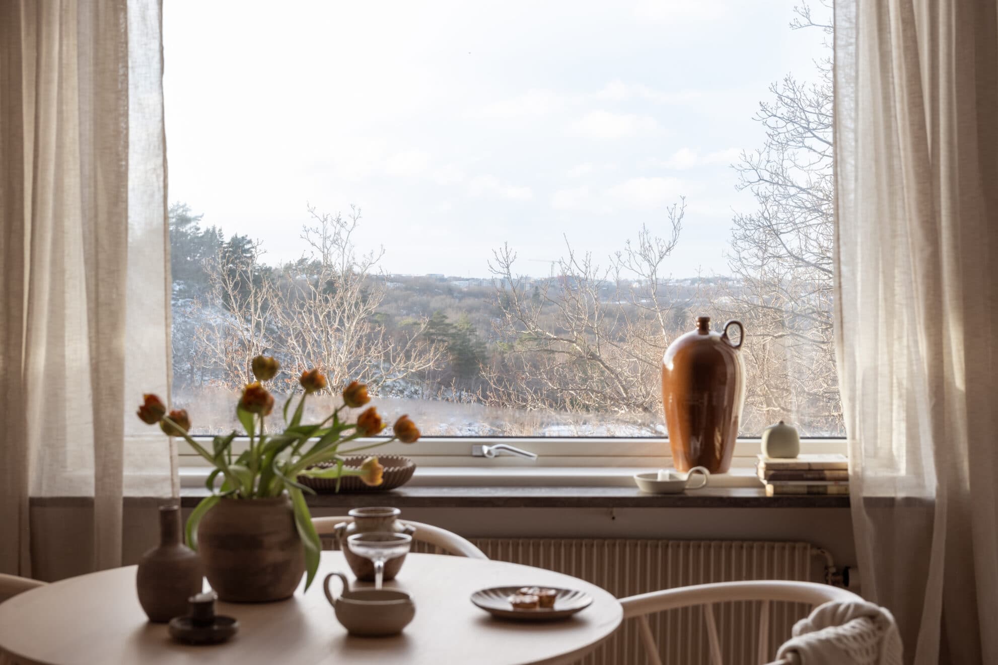 Köket har utgång till lägenhetens inglasade balkong där det finns gott om plats för både möbler och växter. Balkongen har eftermiddags och kvällssol och utsikten över den härliga grönskan från Botaniska trädgården och Slotsskogen skapar en magisk atmosfär såväl vinter som sommar.