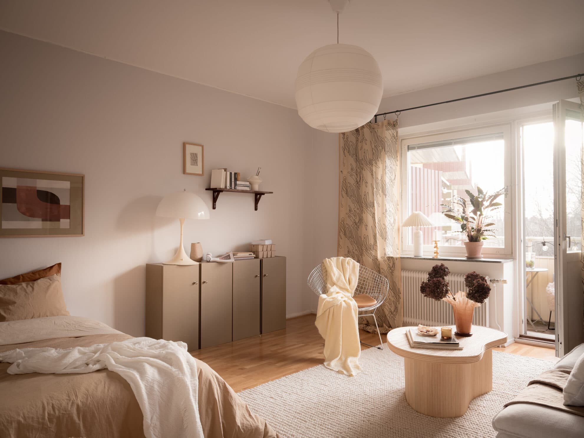 Fönstret i söder fyller vardagsrummet med ljus, och liksom i övriga lägenheten skapar takhöjden en luftig atmosfär. Under sommarhalvåret har balkongen, som vetter mot en lummig gård, sol större delen av dagen. Vardagsrummet är lättmöblerat, och det finns gott om plats för soffa, säng, TV-möbel med mera. Rummets väggar är målade i ljusgrått och golvet belagt med ekparkett.