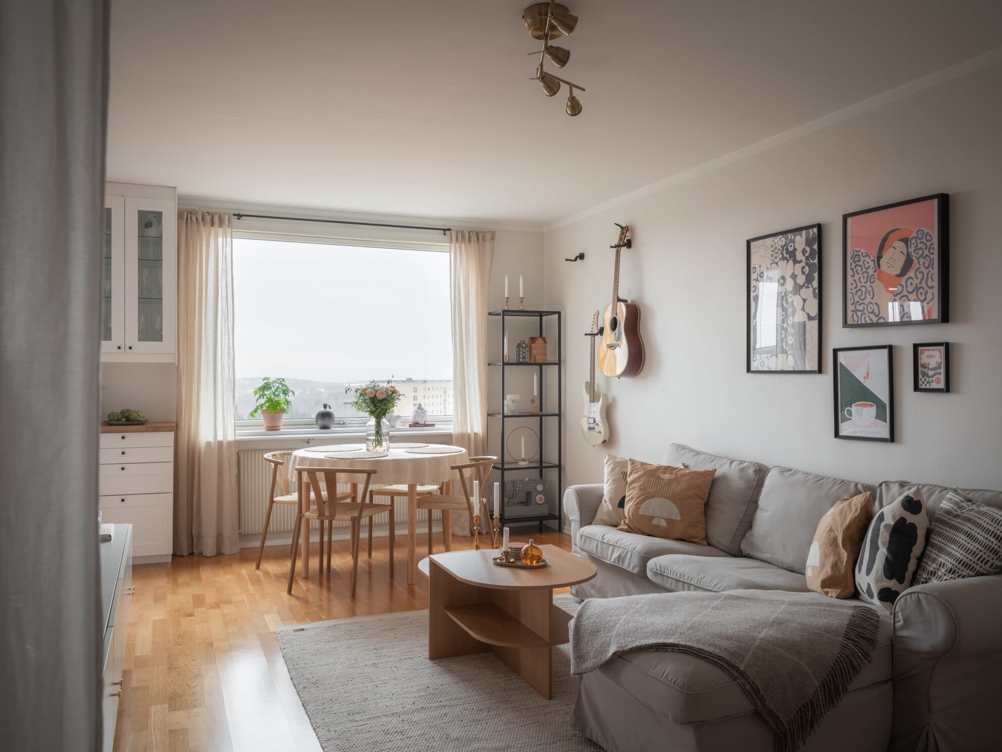 Lägenhetens vardagsrum har ett härligt ljusinsläpp och vid det stora fönstret i sydväst finns det plats för en matgrupp. Från vår till höst är det underbart att sitta och äta ute på den rymliga, inglasade och soliga balkongen med vacker utsikt över lummiga trädkronor ända bort mot Karlatornet och Ramberget. Rummets golv är belagt med ekparkett och väggarna målade i en ljus ton.