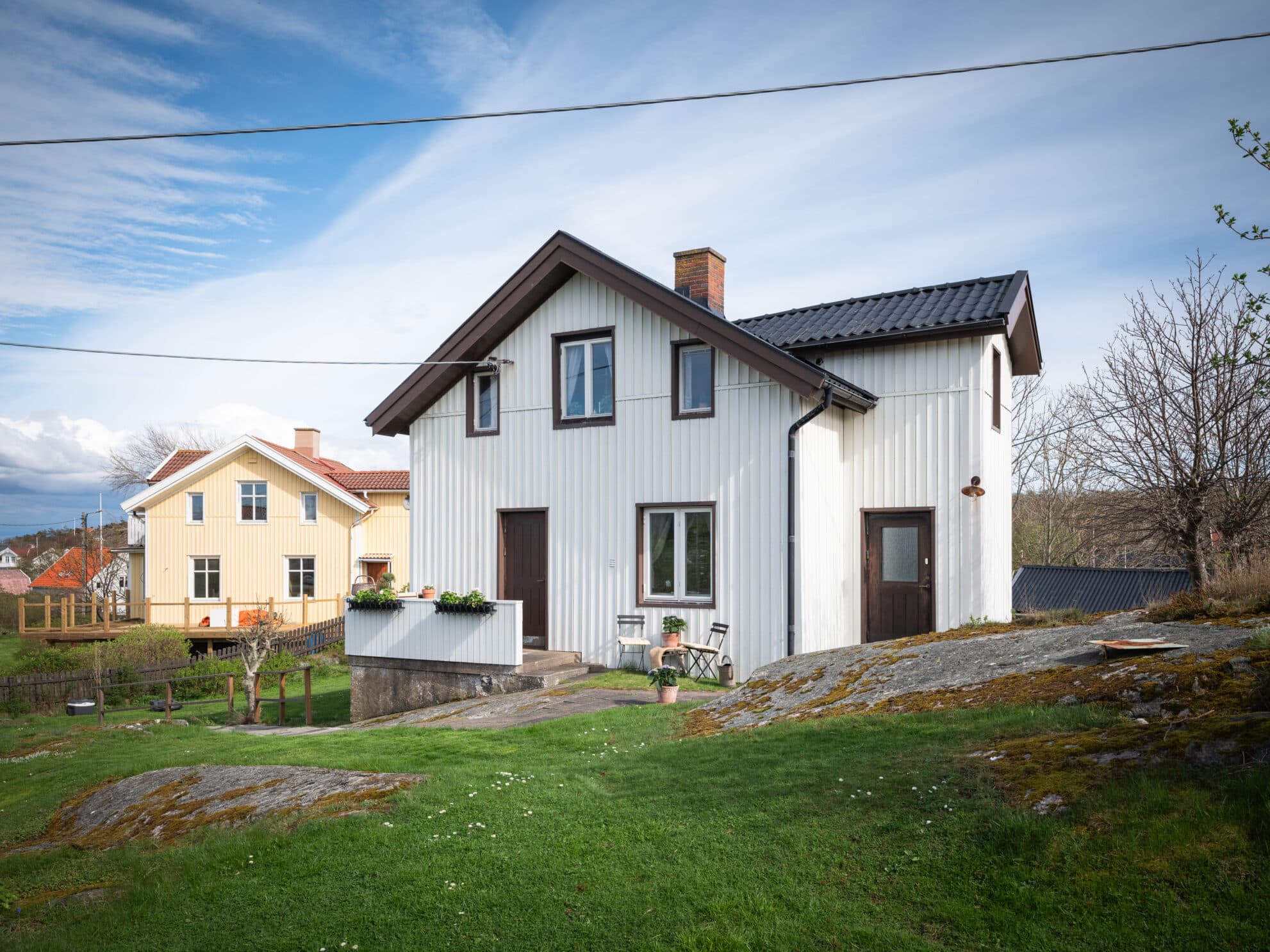 På en liten kulle med fri utsikt över havet vilar detta rara lilla hus, byggt 1905 som ett fiskartorp och sedan dess troget kvar i samma familjs ägo. Här möts du av en tidlös känsla – ett stycke kusthistoria där bevarade originaldetaljer och renovering bildar en vacker helhet. Huset som har en enkel och karaktärsfull silhuett som gömmer mer än man anar. Redan när du kliver över tröskeln slås du av hur luftigt och ljust huset känns – betydligt rymligare än fasaden först antyder. De stora fönstren släpper in havets skiftande ljus, och du bjuds på utsikt mot vattnet från flera av rummen. Invändigt andas huset historia. På nedre plan finns en kombinerad matplats och vardagsrum där en vacker kakelugn och klassisk spiskåpa minner om svunna tider. Här finns också ett mysigt sovrum och ett charmigt kök. En trappa upp möts du av originalträgolv som knarrar sådär hemtrevligt, två små sovrum, ytterligare ett kök och vardagsrum samt ett praktiskt förvaringsrum. Pärlsponten ramar in känslan av sekelskiftesromantik. I mitten av 80-talet gjordes en omfattande renovering då huset blev permanentbostad – man tilläggsisolerade, lade nytt tak och klädde huset i plåtfasad. Två toaletter med dusch byggdes till, tidigare ägarinna tvättade sig enligt tradition i havet med saltvattentvål. Läget är svårslaget – havet som ständig följeslagare, med både mataffär och färjeläge inom bekvämt räckhåll. Ett hus för dig som söker något genuint, personligt och med själ. Ett boende där historiens vingslag fortfarande känns i väggarna, och där framtiden har alla möjligheter att blomstra.