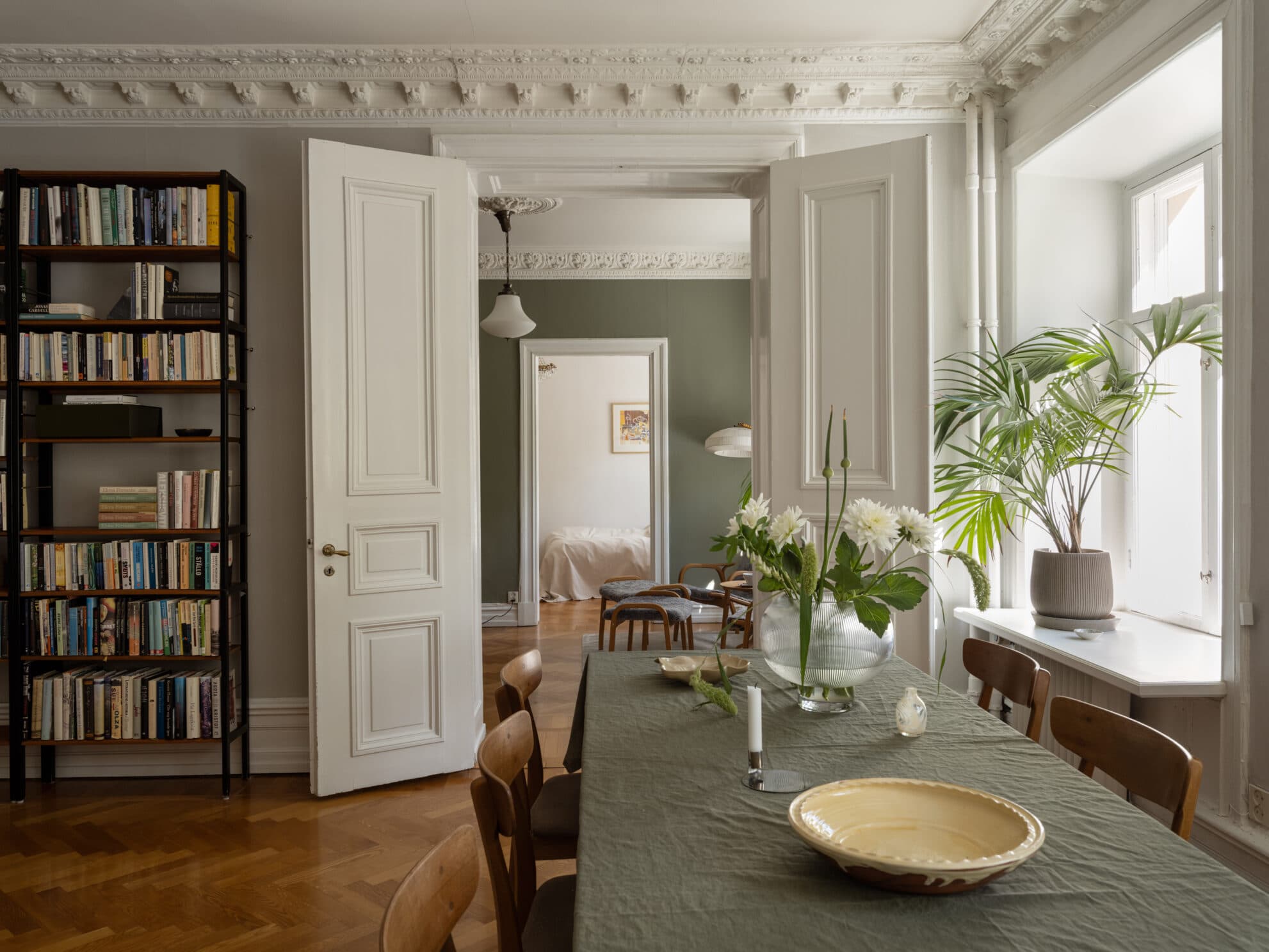 Bakom imponerande pardörrar med spegelglas öppnar sig ett mångsidigt rum som idag används som kontor, men som lika gärna kan fungera som en stilfull matsal. Här ryms allt från vardagsmiddagar till större tillställningar. Väggarna är klädda i en elegant grågrön tapet, och golvet pryds av samma vackra fiskbensparkett som i vardagsrummet.