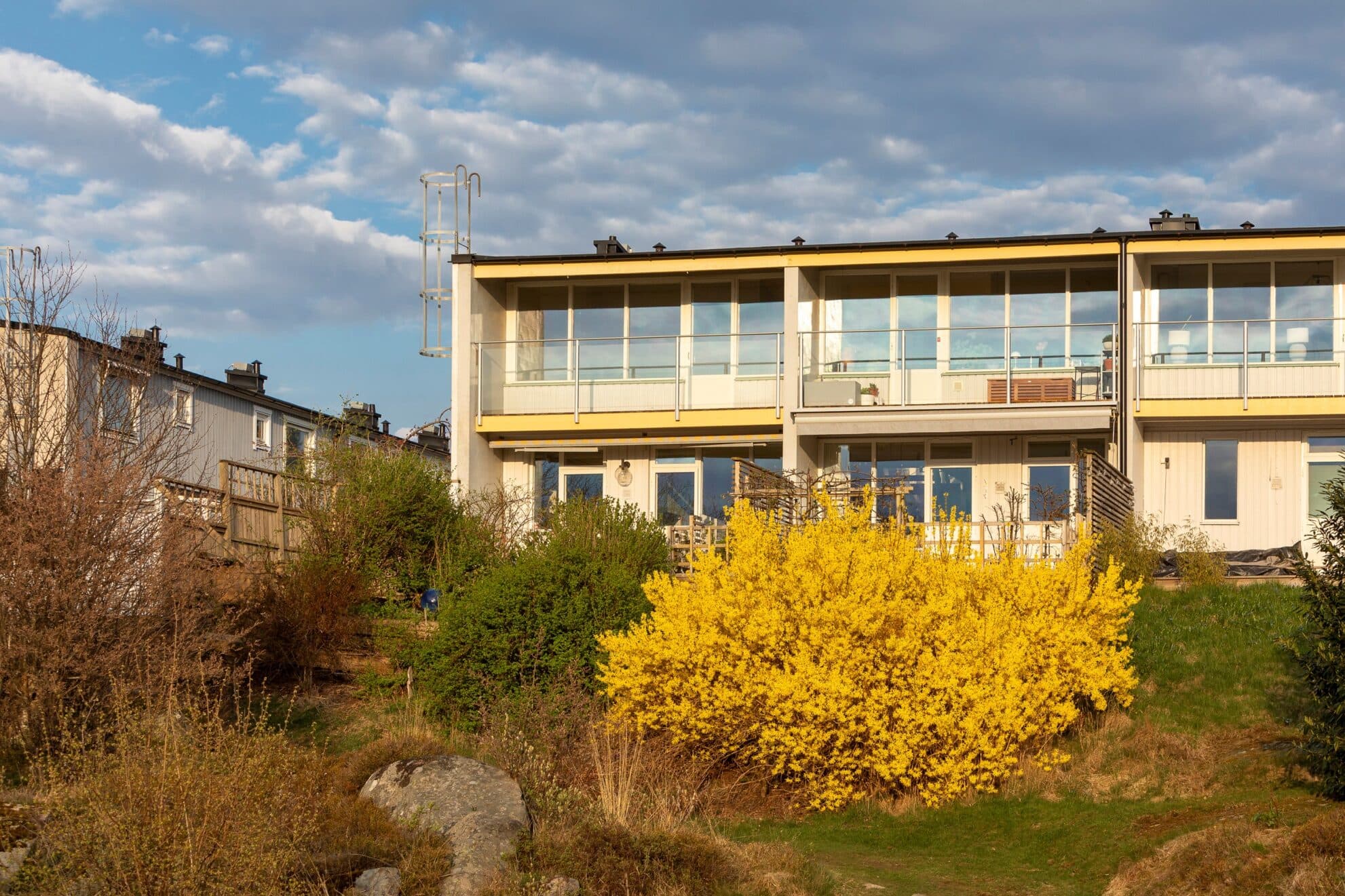 Med ett av områdets mest ogenerade och naturnära lägen bjuder detta hem på en inramning utöver det vanliga. Här bor du granne med naturen, längst ut i området, med fri utsikt mot Göteborgs hamninlopp och älvens glittrande mynning i väster. På både altanen i markplan och den generösa balkongen på övre plan får du solens sista strålar och en storslagen horisont – ett läge som andas lugn och rymd. Radhuset är uppfört i två plan och har varsamt uppdaterats med respekt för originaldetaljerna. Här finns fina parkettgolv i lackad ek och ask, mjuka färgsättningar och genomtänkta ytor som passar både familjeliv och det mer representativa hemmet. Takhöjden i vardagsrum och sovrum på övre plan är delvis förhöjd, vilket skapar en härlig känsla av volym och ljus.